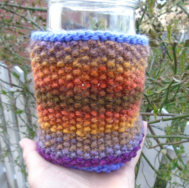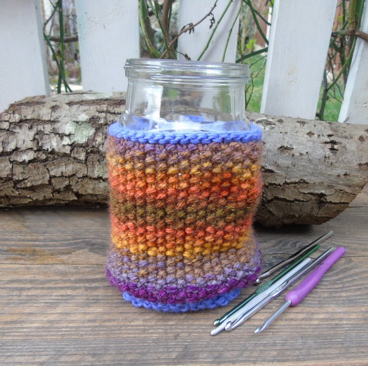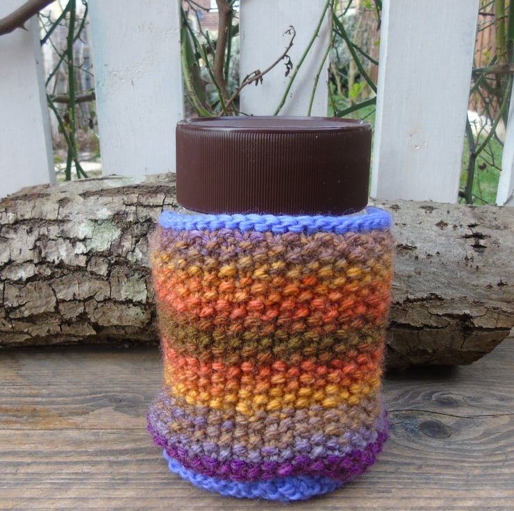 A colourful knitted plant pot cover or glass jar cover.