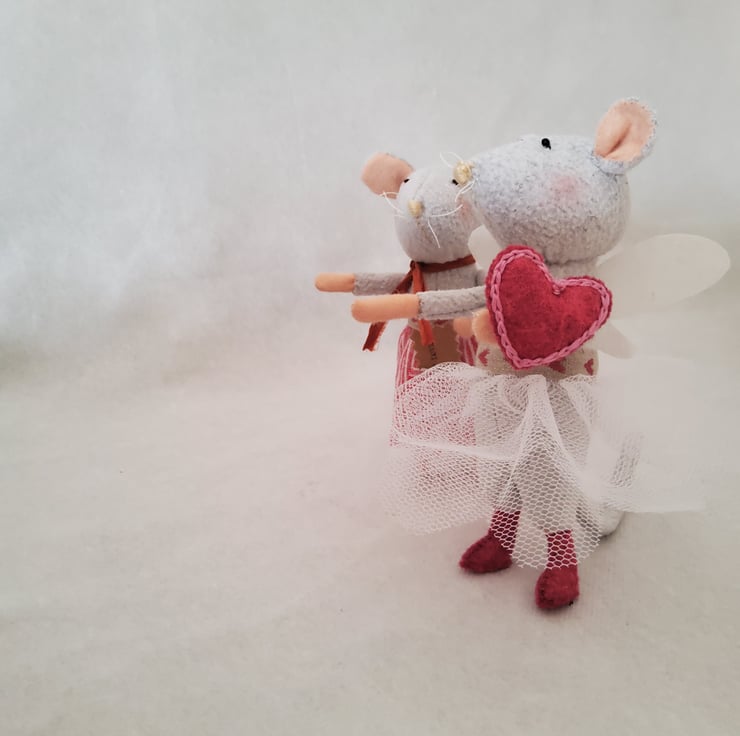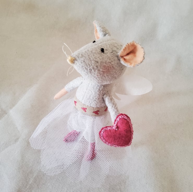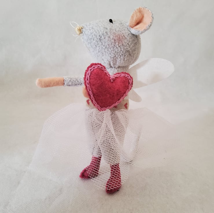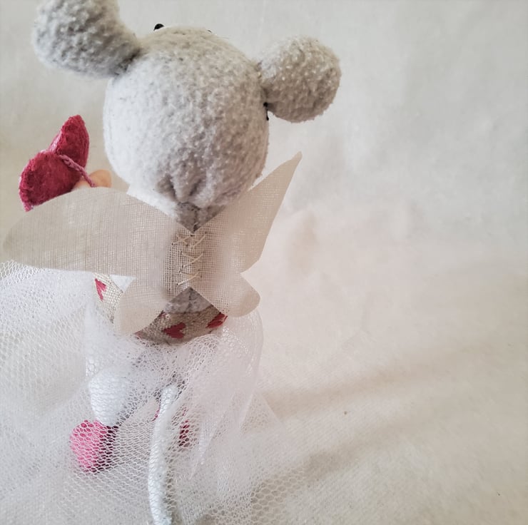 Fairy Mouse is made from sweatshirt fabric - she has a wire armature along with a wired tail that make her freestanding and posable. She wears a scallop edged tu tu finished with a linen ribbon. She has wool felt little boots and a heart which isn't attached to her arm ( it has a loop on the back ). Her wings have been made from a vintage petticoat and stitched to her back. She also has glass bead eyes and an embroidered nose.