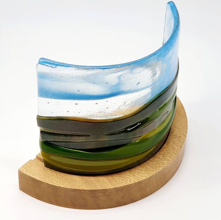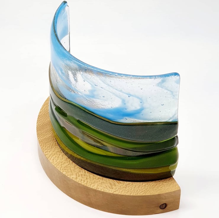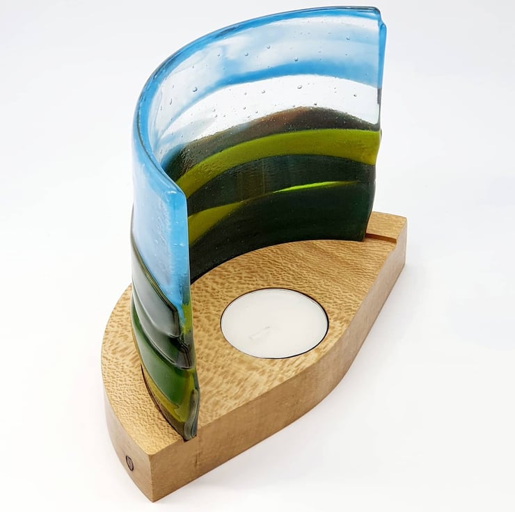 A fused glass landscape of rolling hills in many shades of greens & browns. The blue whispy sky has lots of transparent glass allowing the flickering of the candle behind to create a beautiful shimmer.