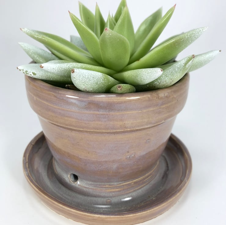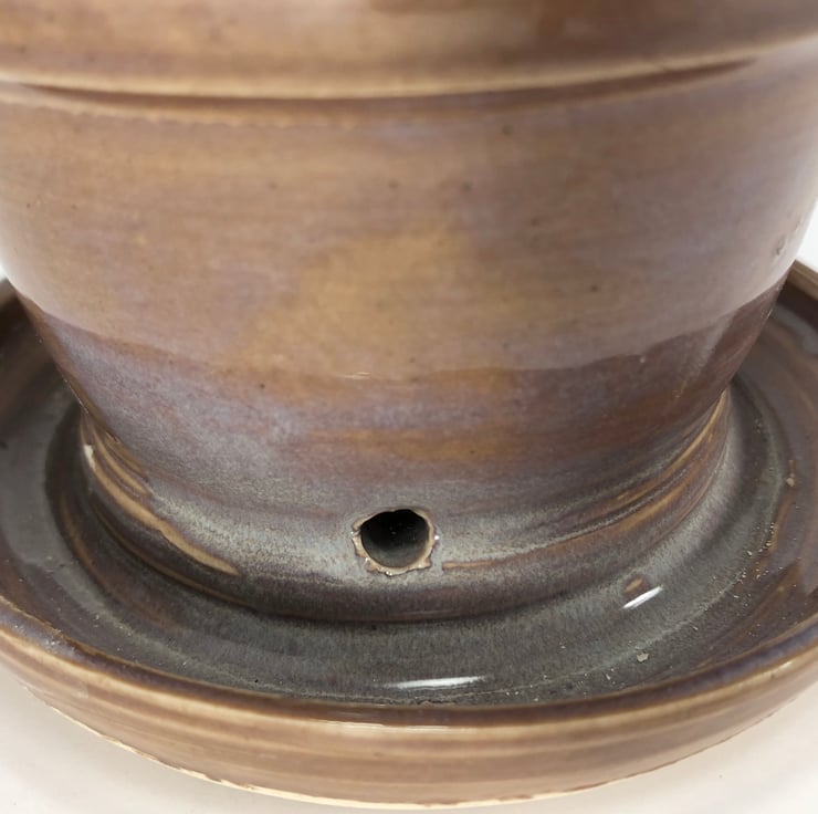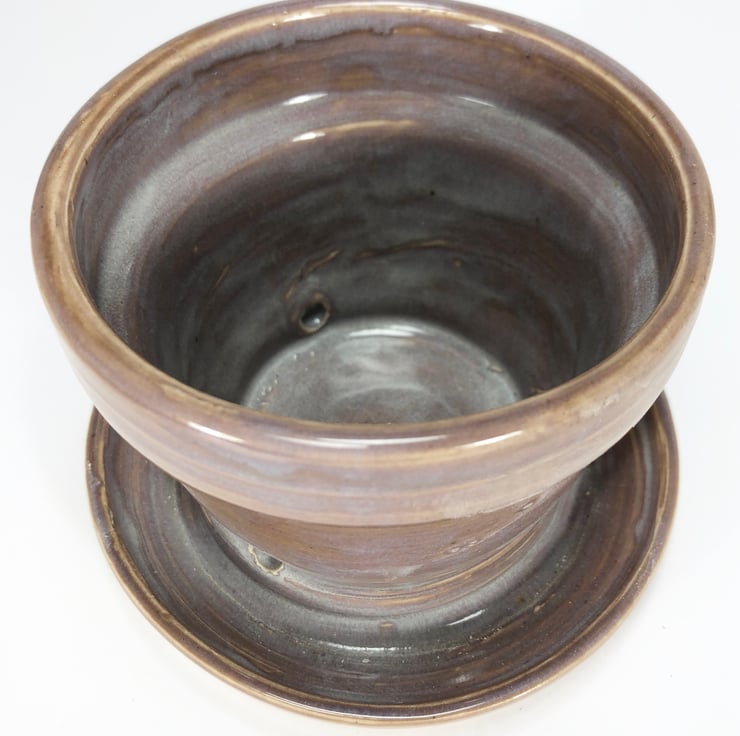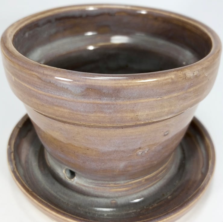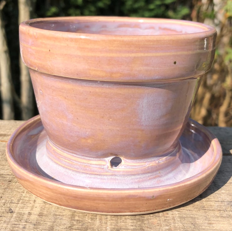 This is a listing for a wheel thrown planter with built in saucer/tray and drainage holes.