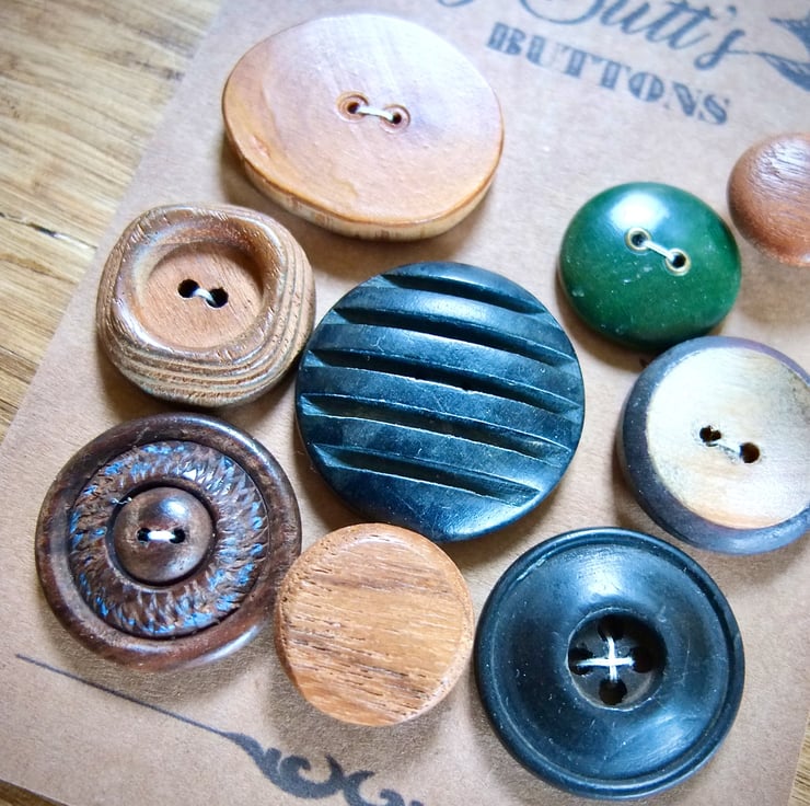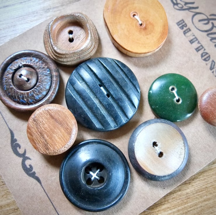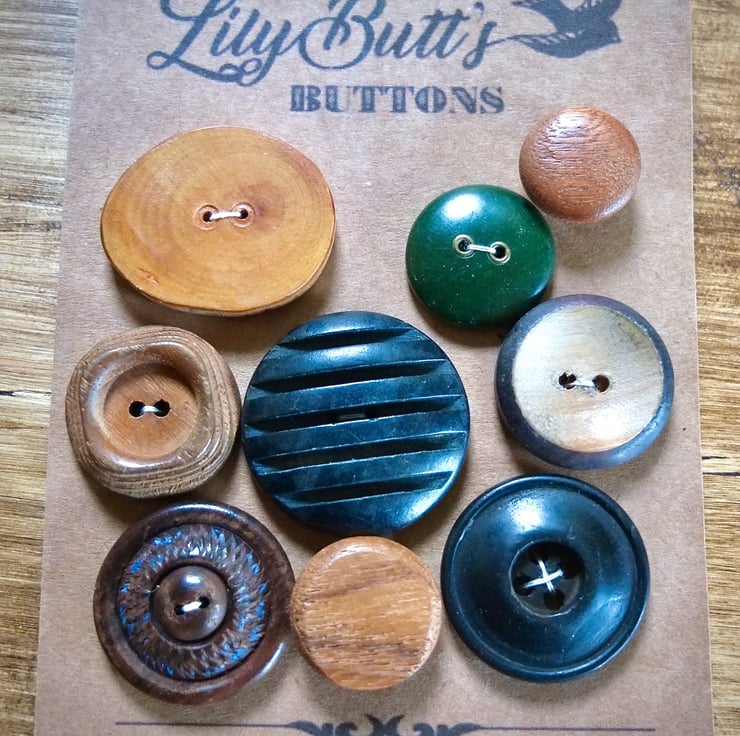 9 Gorgeous, Vintage Wooden Buttons, lovely mix of colours and sizes. Largest measuring 36,30mm and the smallest 20mm.