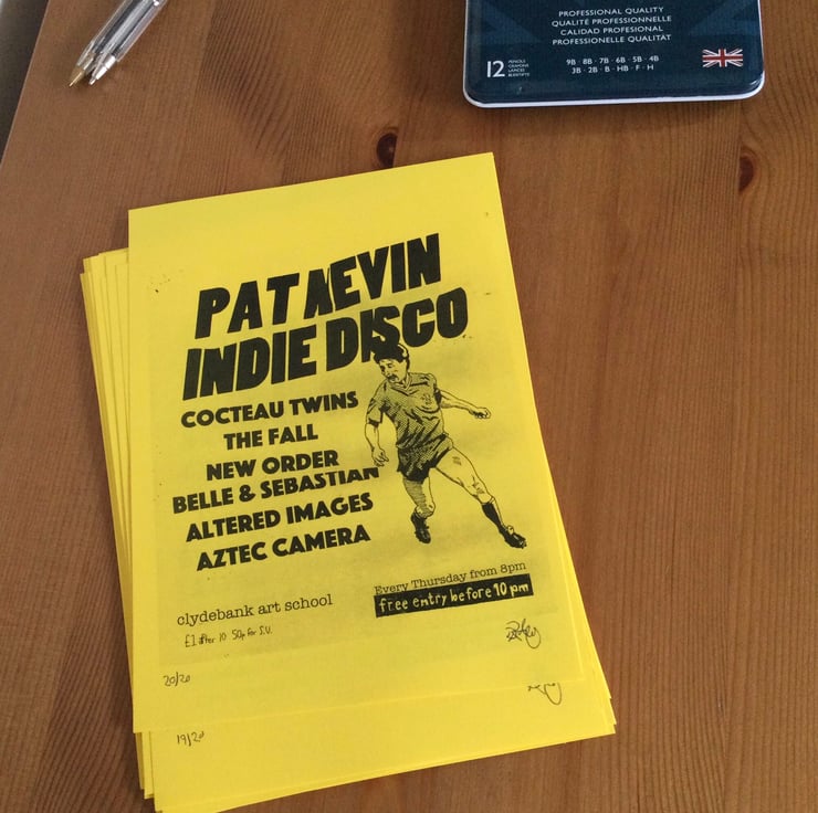 I was inspired to make this after speaking to an Everton fan so set about to recreate the perfect Pat Nevin Indie Disco flyer. The bands are there, the venue (made-up) is spot on, the slightly handmade, photocopied look is there. And more importantly, it looks great in a frame!