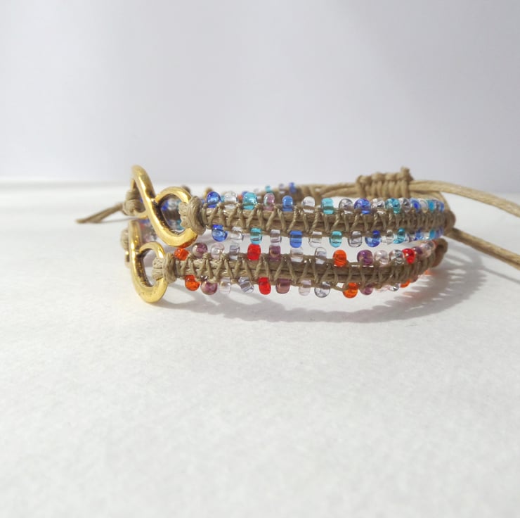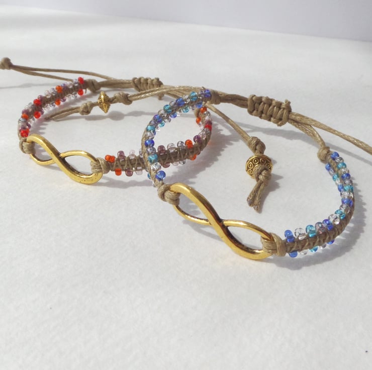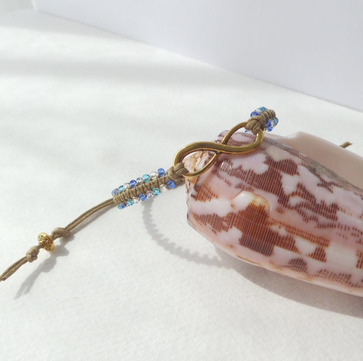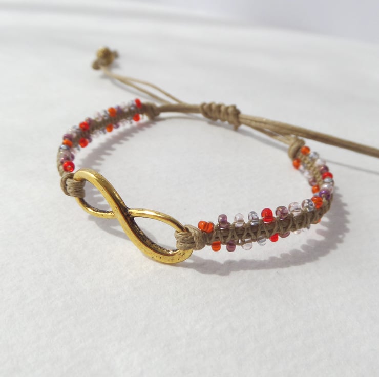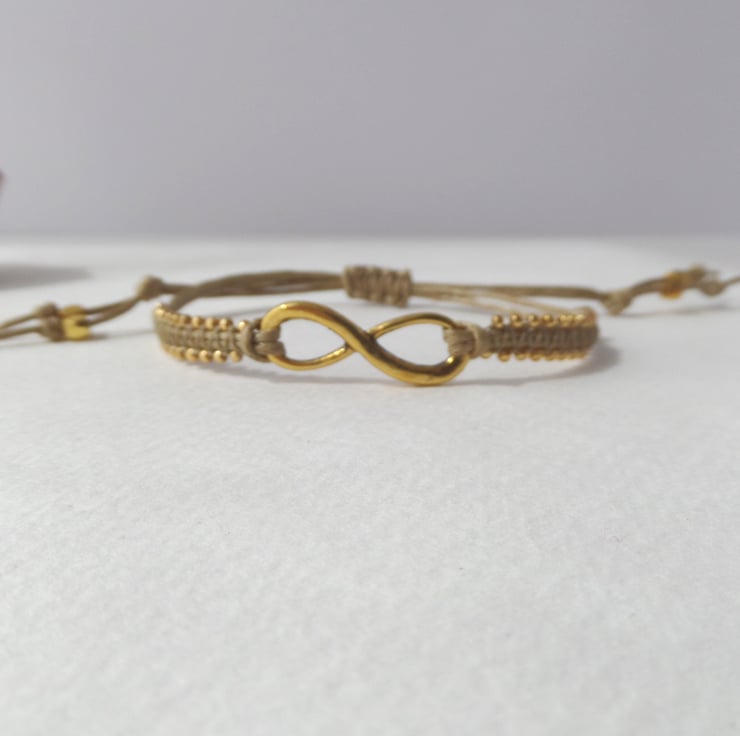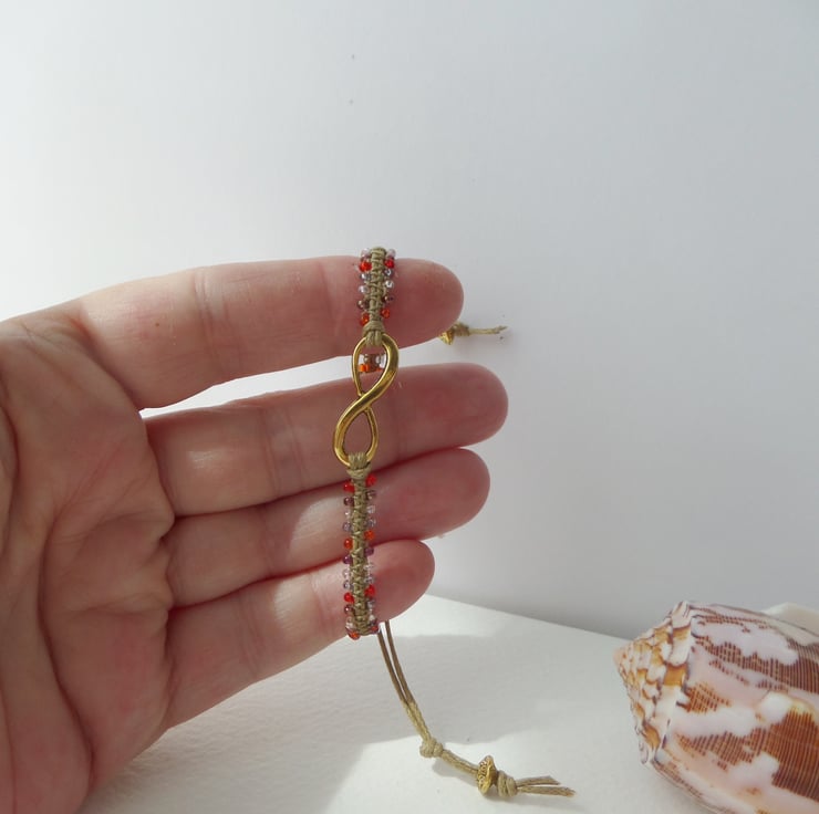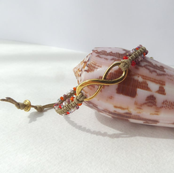 A gorgeous Tibetan 'gold' infinity symbol is the focal on this macramé bracelet, With glass beaded straps and macramé over the cotton cord.