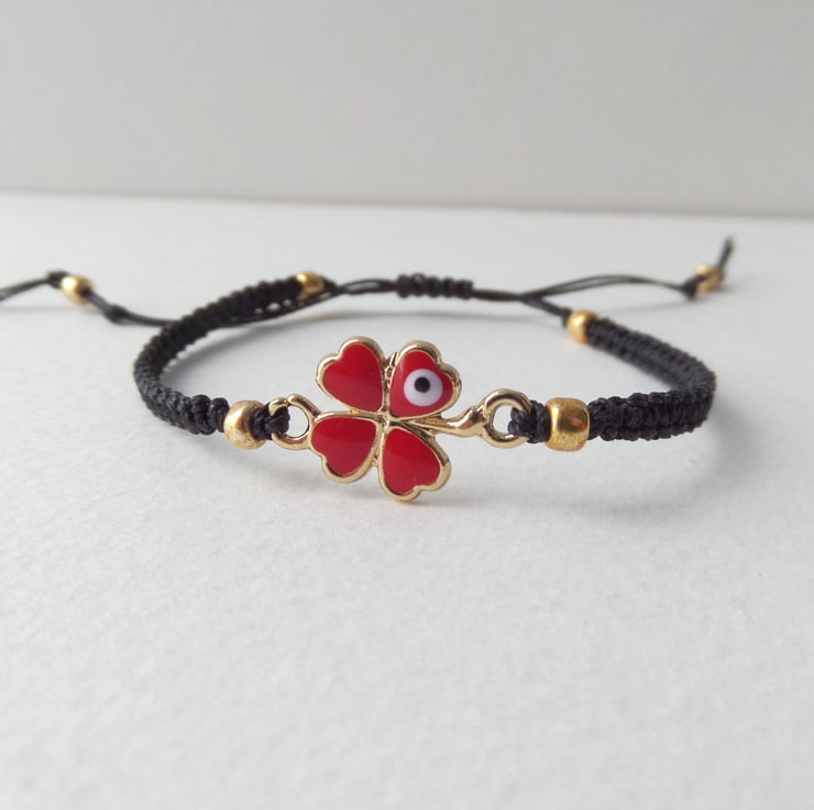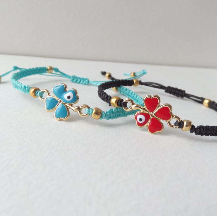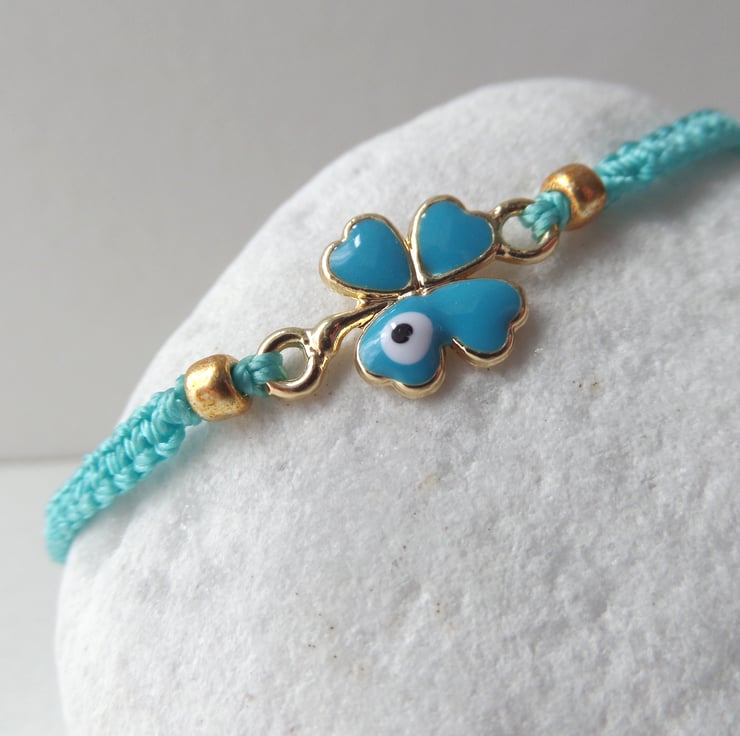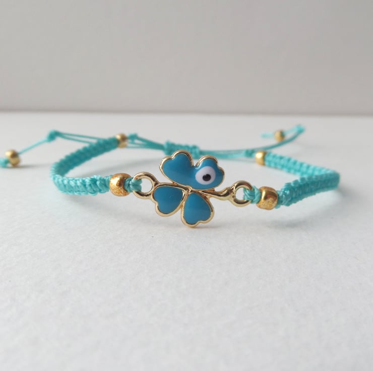 Four Leaf Clover Bracelet, Lucky charm, Gold evil eye, protection Bracelet.