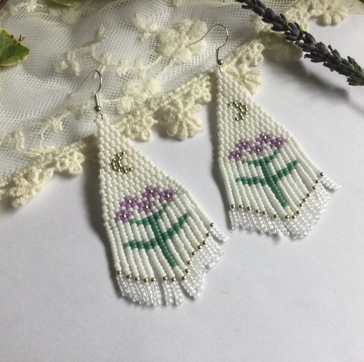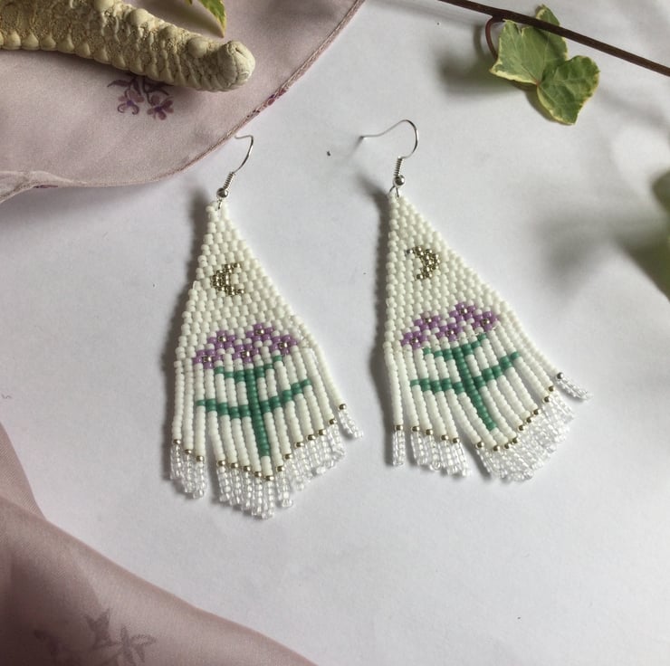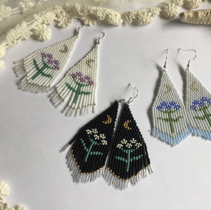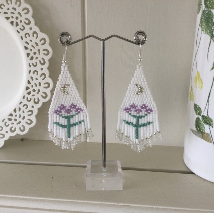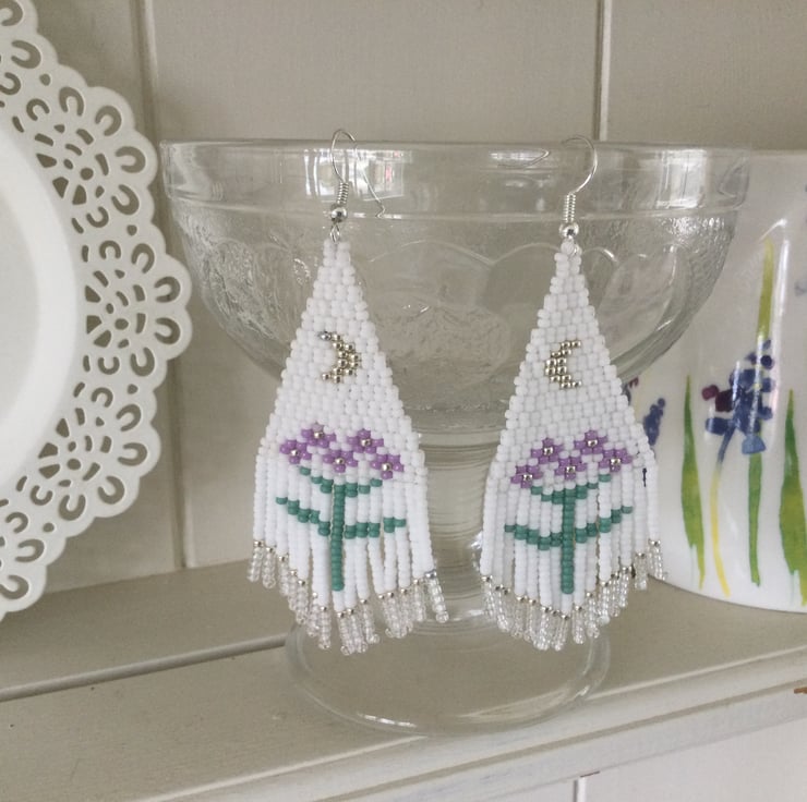 These pretty earrings are a fun and lovely accessory. Lovingly handwoven using Miyuki glass seed beads to create a beautiful flower design, inspired by the clouds of Cow Parsley that adorn our hedgerows in the Summertime.