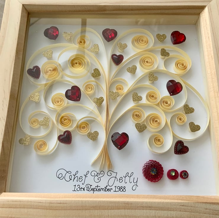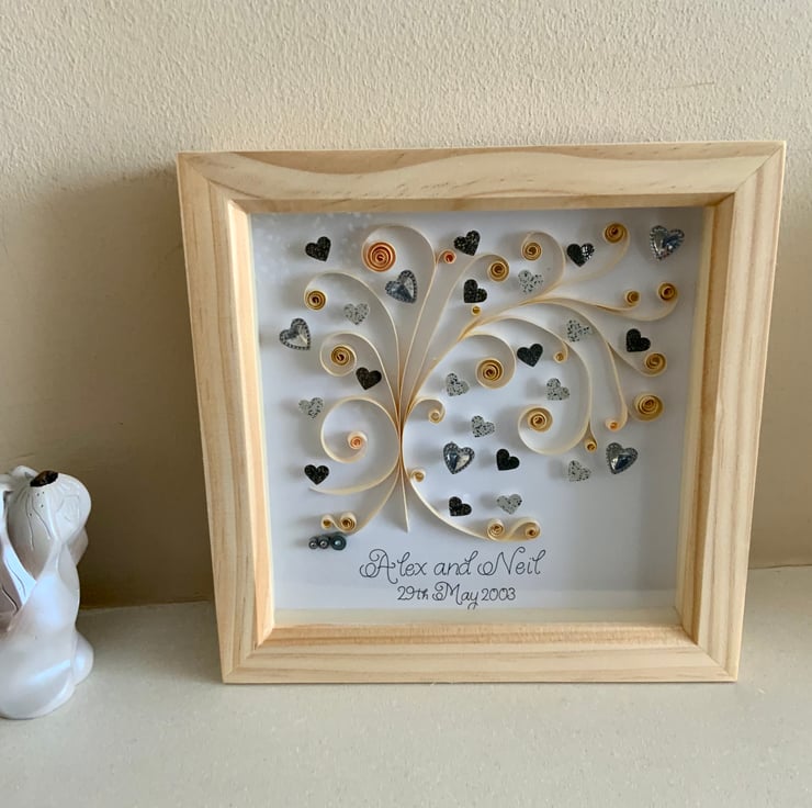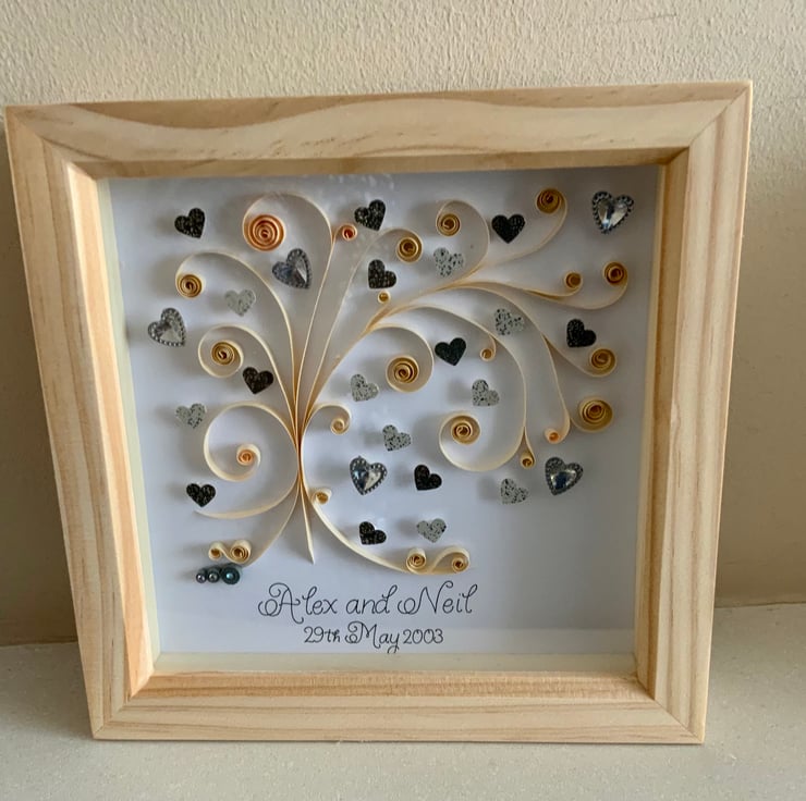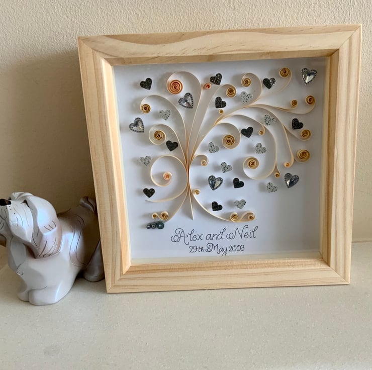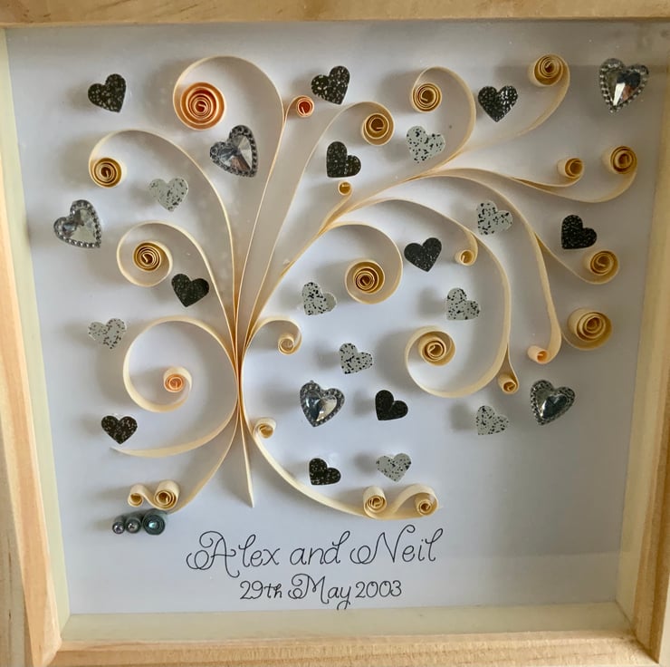 A hand crafted scrolled paper craft tree , with silver hearts and Preciosa Czech gems .