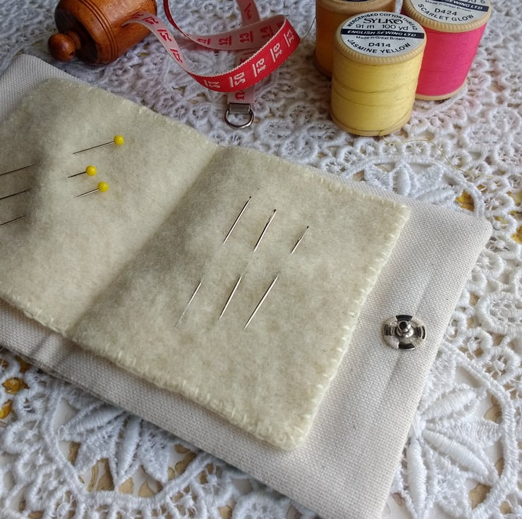 Between the outer and lining fabric is a piece of wadding made from natural fibres so the needlecase is nice and plump. Needles can also be pinned to the lining, the layer of wadding will help prevent them poking through to the front.