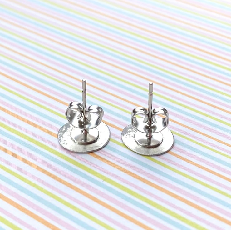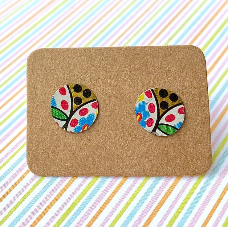 A sweet little vintage trinket tin was the origin of these studs. 9mm discs have been cut from the tin and smoothed around the edges. The vibrant multicoloured pattern is sure to brighten any day! The ear posts are steel with butterfly fastenings.