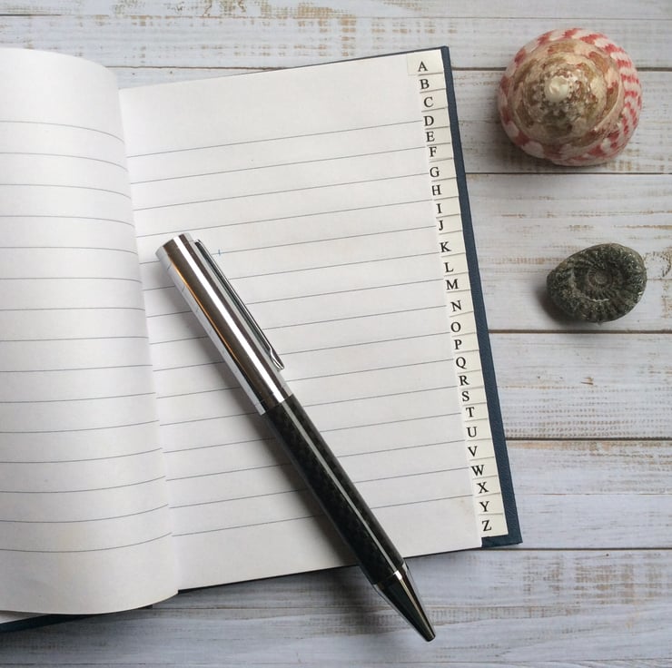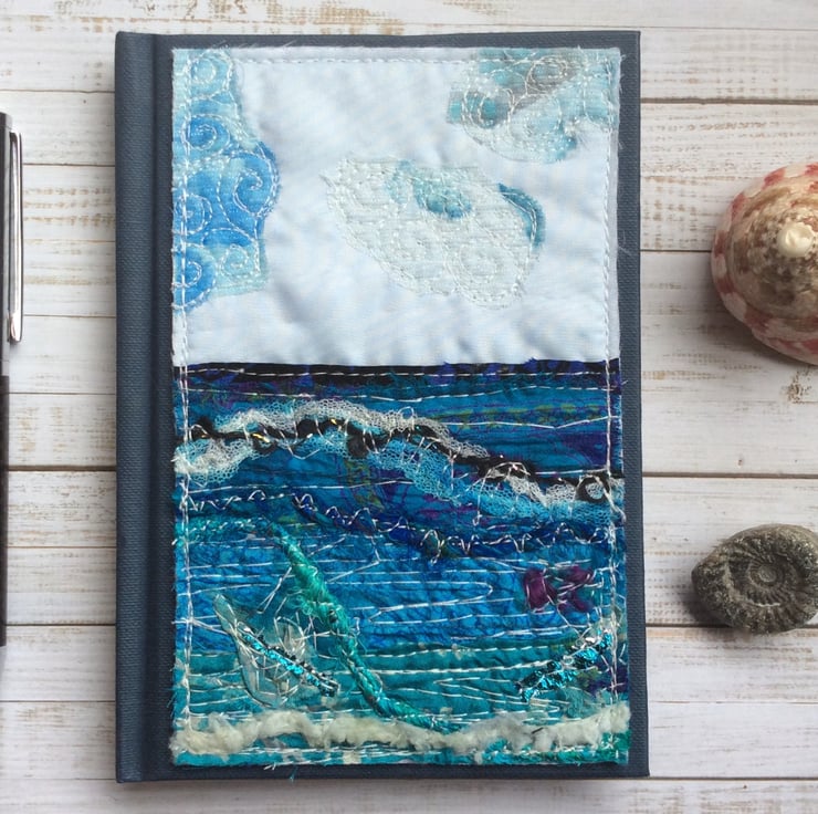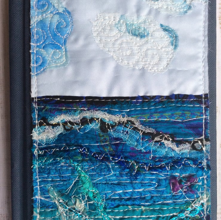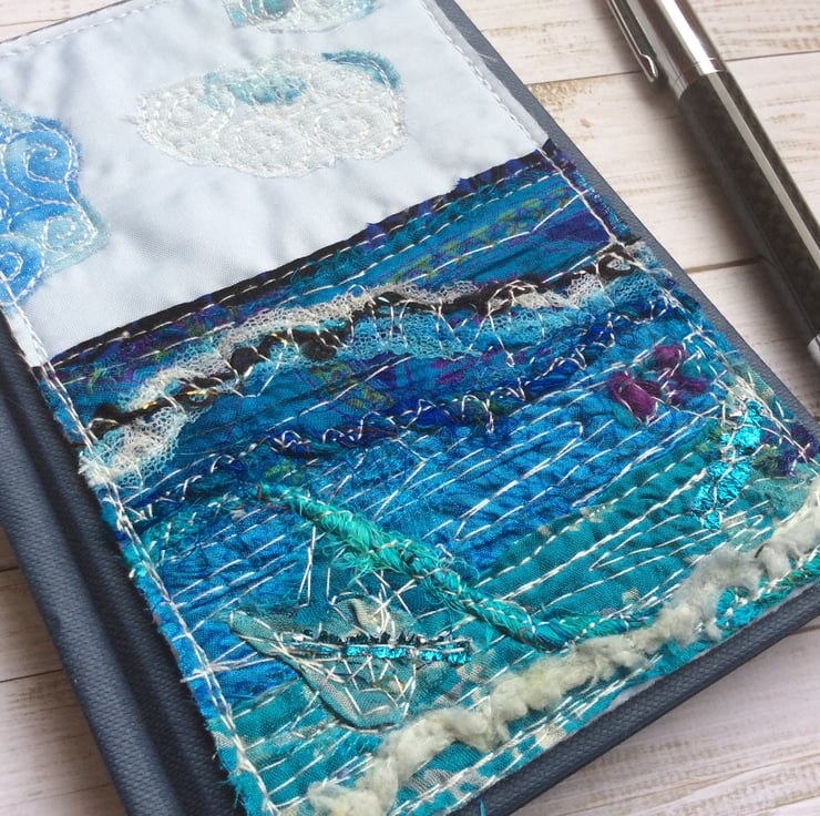 This hardback stitched A5 embroidered address book is enhanced with a layered up-cycled seascape made of recycled silk, ribbons, recycled silk thread, netting, wool and free motion embroidery. The book measures 15.5 x 11cm. The embroidery measures 15 x 8.5cm. A-Z index section with 4 pages per letter (T, U, V, W, X have three pages and Y & Z have two pages.