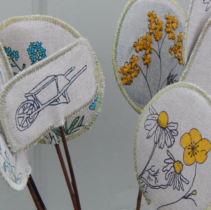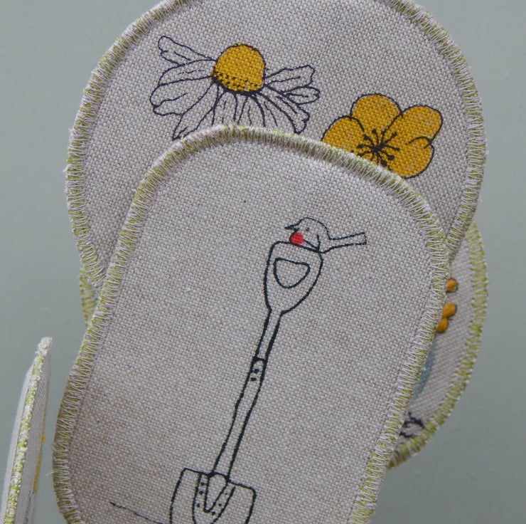 There are a mix of buttercup and chamomile daisy circles, with forget me not and yarrow. The flowers have been hand painted for a little pop of yellow or blue, with acrylic ink. The yarrow has been hand embroidered in a golden yellow linen thread. There is a screen printed wheelbarrow and spade with a Robin redbreast perched on top.