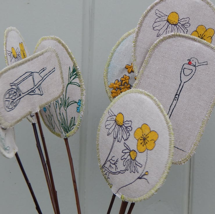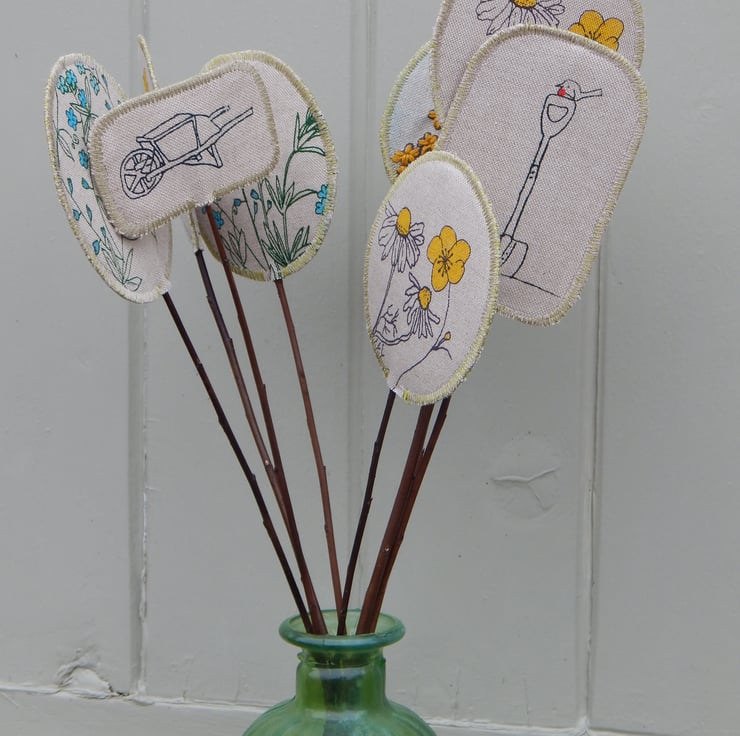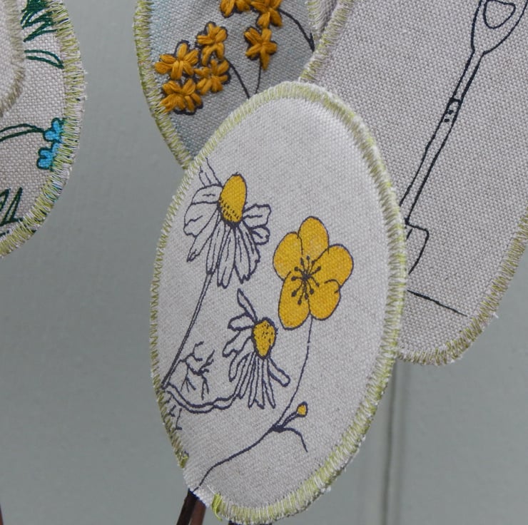 This is a bouquet of 8 fabric on willow creations. Each is double sided with interfacing for stability. They are all have running stitch and then a zig zig stitched finishing to ensure fraying is kept to a minimum. They are then hand glued onto willow which measures about 30 cm in length.