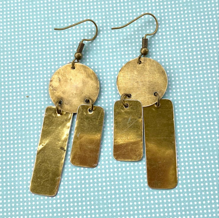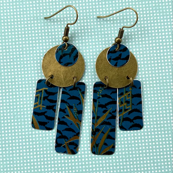 Large geometric shape earrings in a lovely shade of teal blue with gold detail. They originated from a decorative vintage tin with an oriental theme. The shapes were hand cut from the tin, smoothed around the edges and matched with antique bronze discs to create these statement earrings. Truly unique and one of a kind!