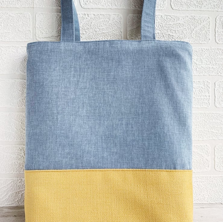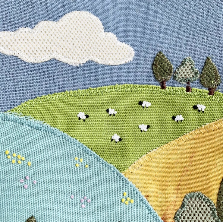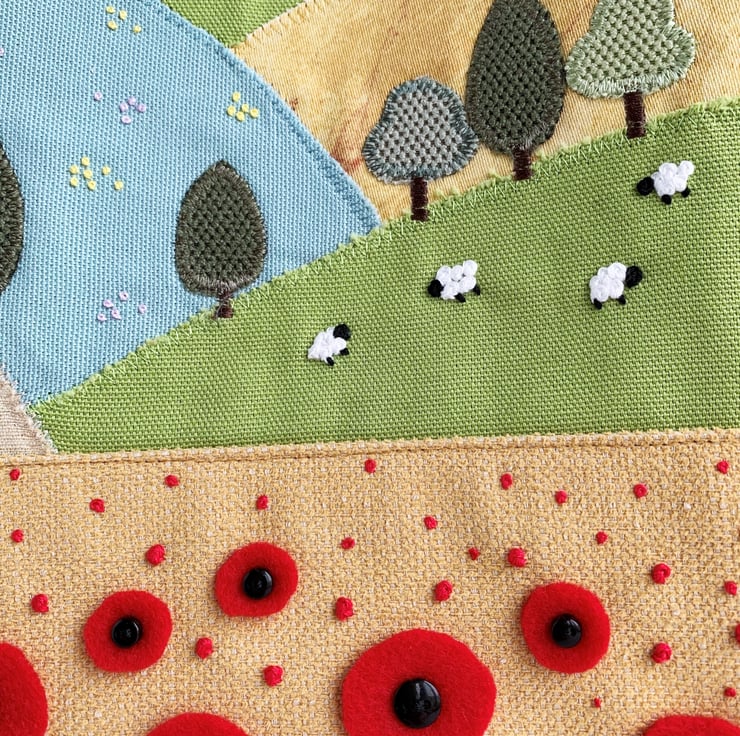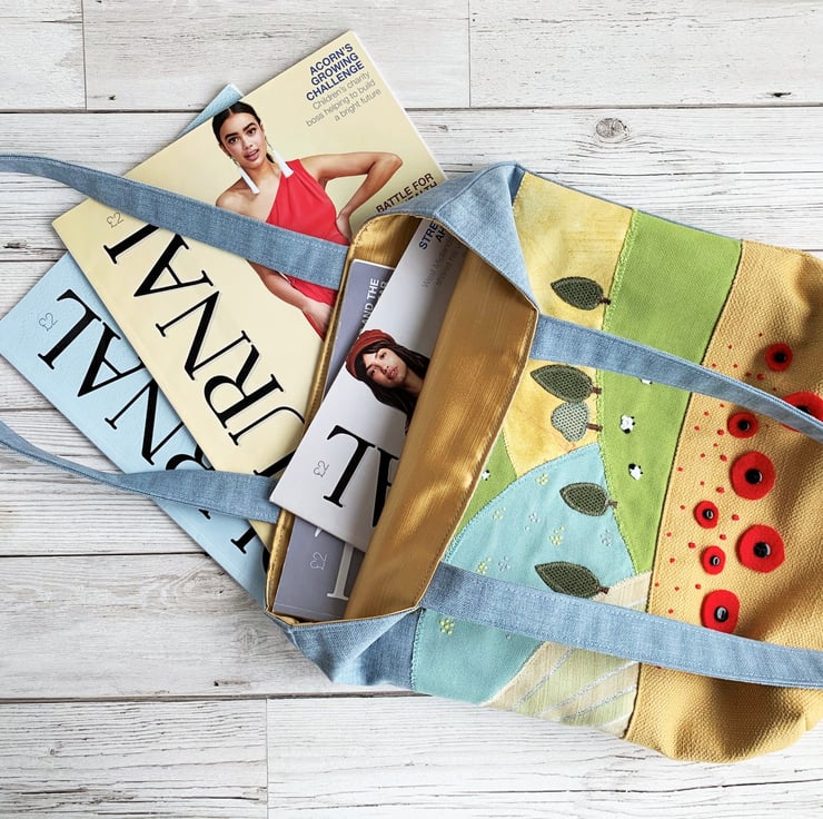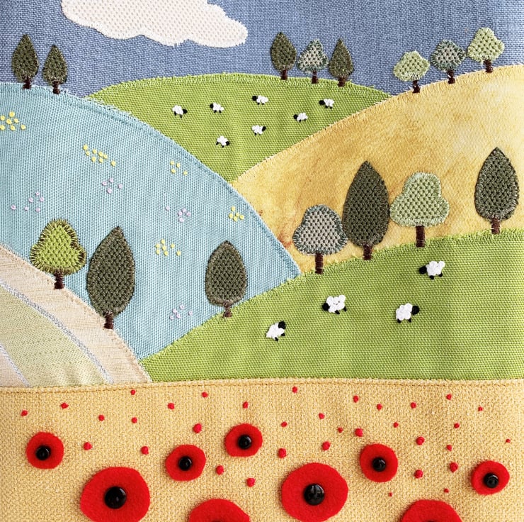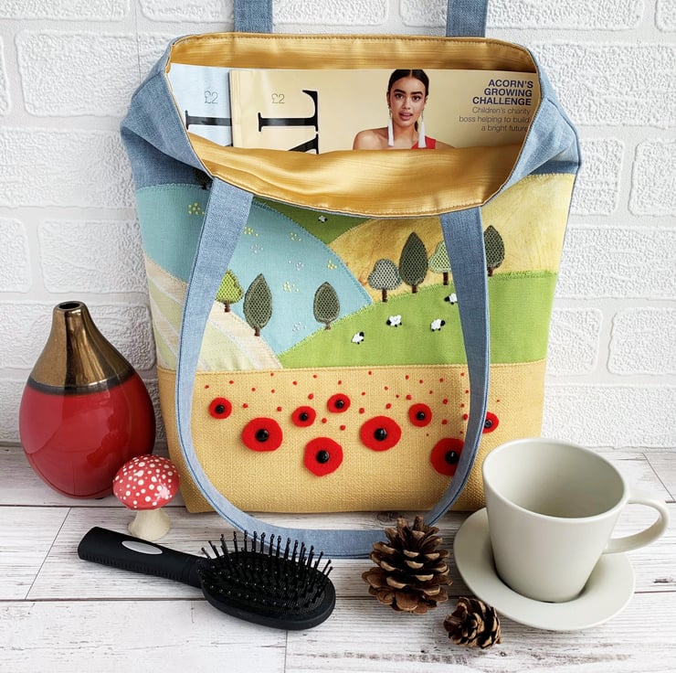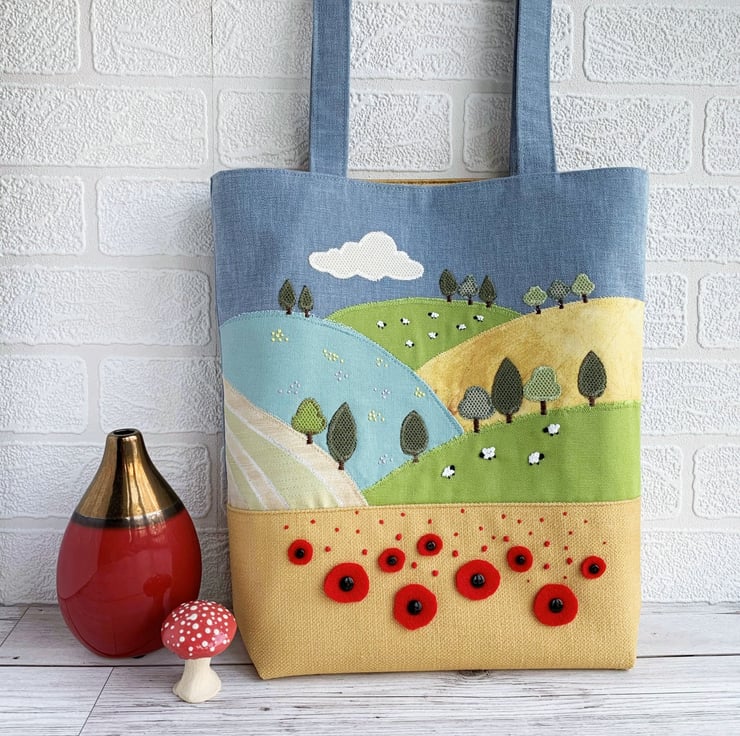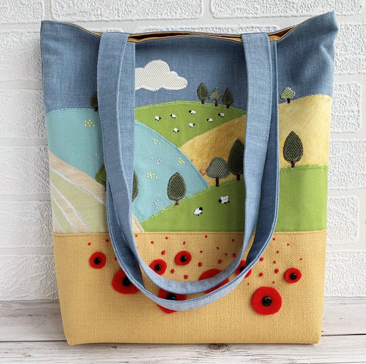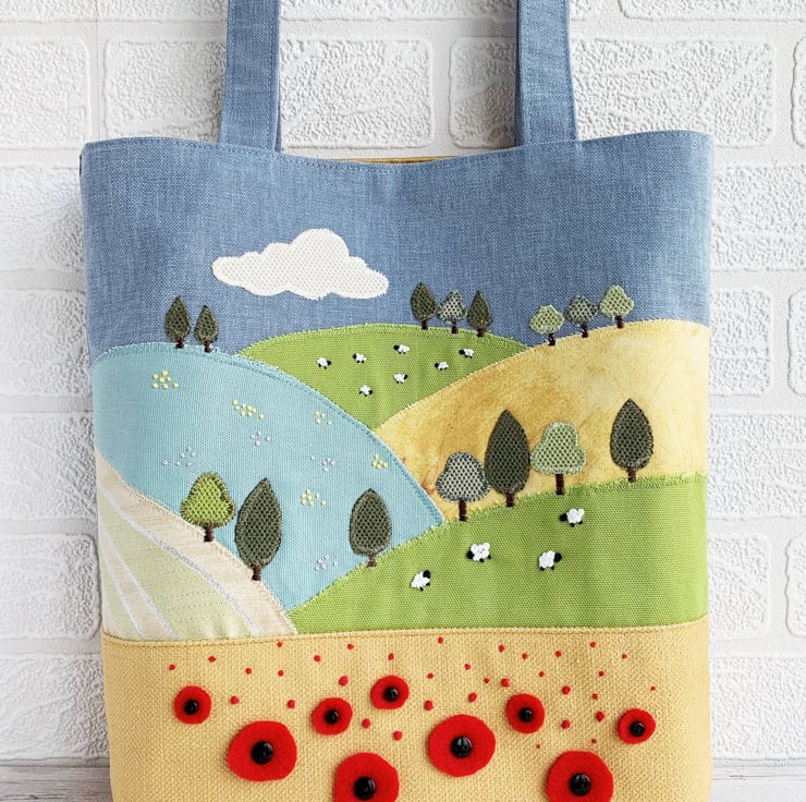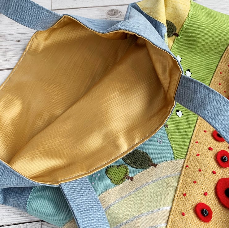 English countryside tote bag. This delightful tote bag has an appliqué and hand-embroidered design depicting a scene of English countryside fields and hills in summer. The lower part of the bag is made from golden-yellow fabric and the upper part from blue fabric. The golden-yellow lower front depicts a corn field full of poppies in the foreground of the scene. The larger poppies are hand-cut from red felt and attached with black button centres. The smaller ones are hand-embroidered french knots. Behind this field is an appliqué series of further fields on hills, made from a variety of fabrics in shades of green, golden-yellow and cream. I've added numerous little appliqué trees in a few shades of green. I've used french knots to embroider sheep in two of the fields, and clusters of yellow and lilac wild meadow flowers in another. The blue upper front depicts the sky, to which I've added an appliqué cloud. The bag is lined with rich gold satin.