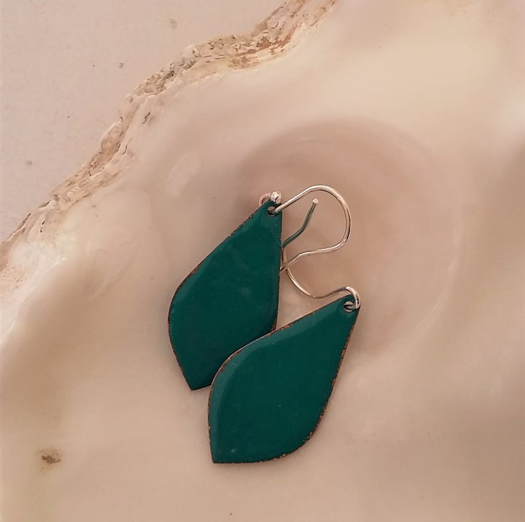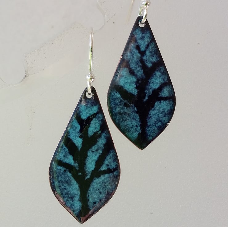 A pair of copper drop earrings with a bare branch tree design enamelled on each. The earrings have been kiln-fired and each measures approximately 28mm long and 15mm wide at the widest point, and come complete with sterling silver earring wires. The backs have been finished in glossy turquoise enamel and they are supplied with a little organza pouch.