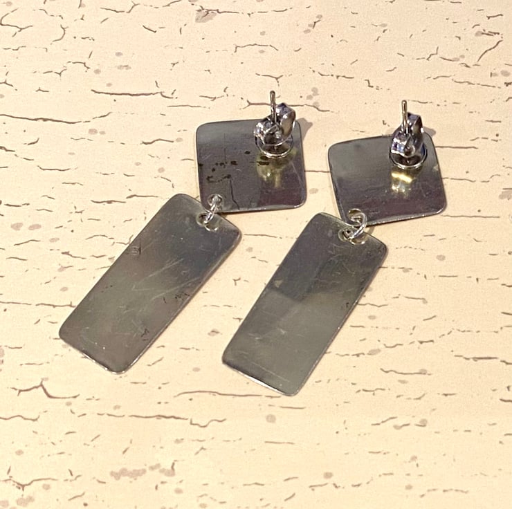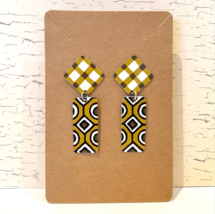 You don’t get much more retro than these 60’s vibe ochre patterned earrings! Once part of a vintage patchwork tin, the shapes have been hand cut, smoothed around the edges and joined with a silver plated ring. They have steel stud backs with butterfly fastenings. They are 47mm long and 19mm wide.