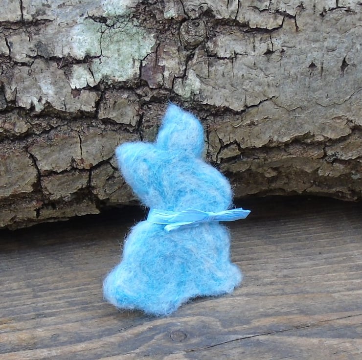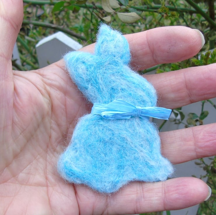 A needle felt wool brooch of a blue rabbit with a matching pink bow.