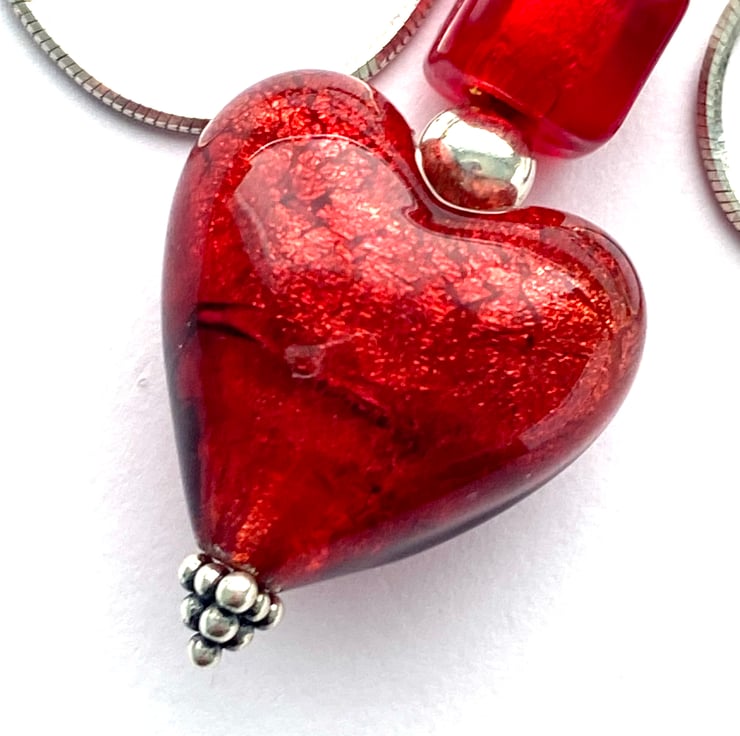 A gorgeous Murano glass heart pendant with a silver foiled rubino deep red Murano glass heart bead (20mm) and a rubino Murano glass cube bead with a sterling silver round bead (pendant height 30mm). The pendant hangs from a sterling silver chain (18 ins) and is presented in a velvet gift bag.
