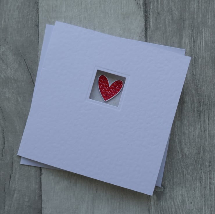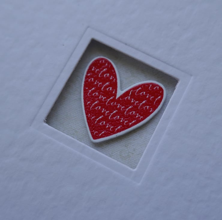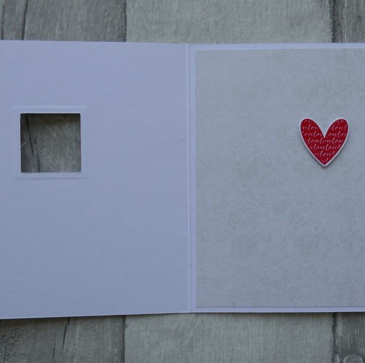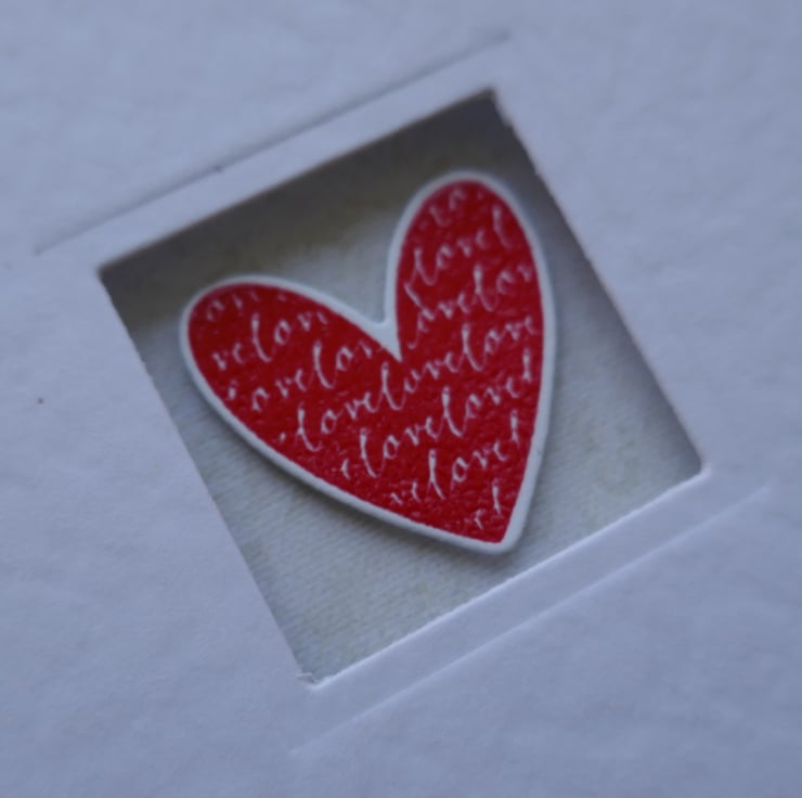 A one inch square has been die cut in the front of the card and the edge has been embossed. a piece of beige patterned paper has been attached to the inside back of the card. A small red heart with a 'love' pattern has been stamped in bright red ink and embossed so it shines. This has been die cut and attached to the inside of the card with a foam pad so it fits inside the aperture.