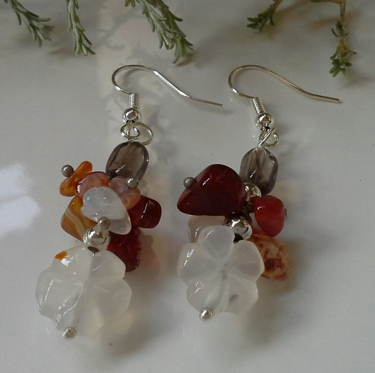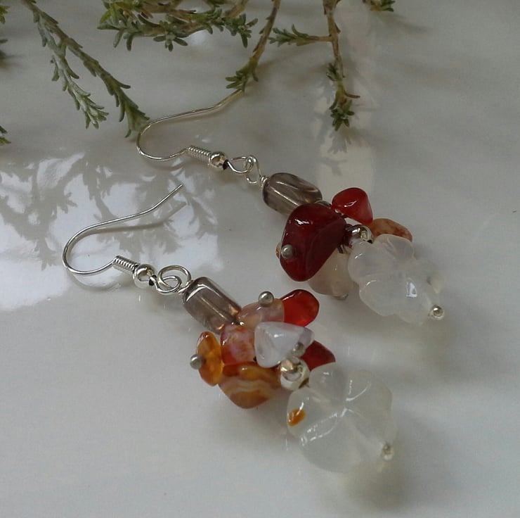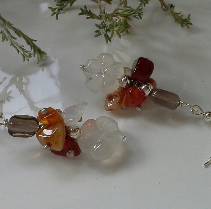 A very pretty pair of earrings designed and hand crafted using genuine carnelian and smokey quartz gemstone beads. Carnelian is a naturally warm glowing gemstone. It's colours range from off white through to burnt orange. The carnelian flowers are hand carved/engraved by skilled labidorists with years of experience behind them. The faceted smokey quartz have good clarity with a soft light brown to compliment the carnelian colours.