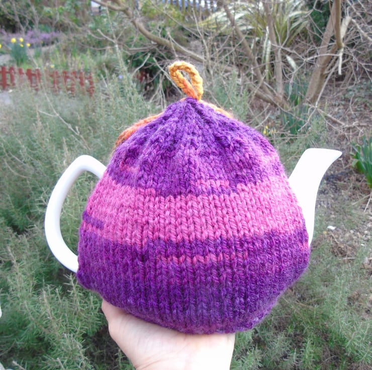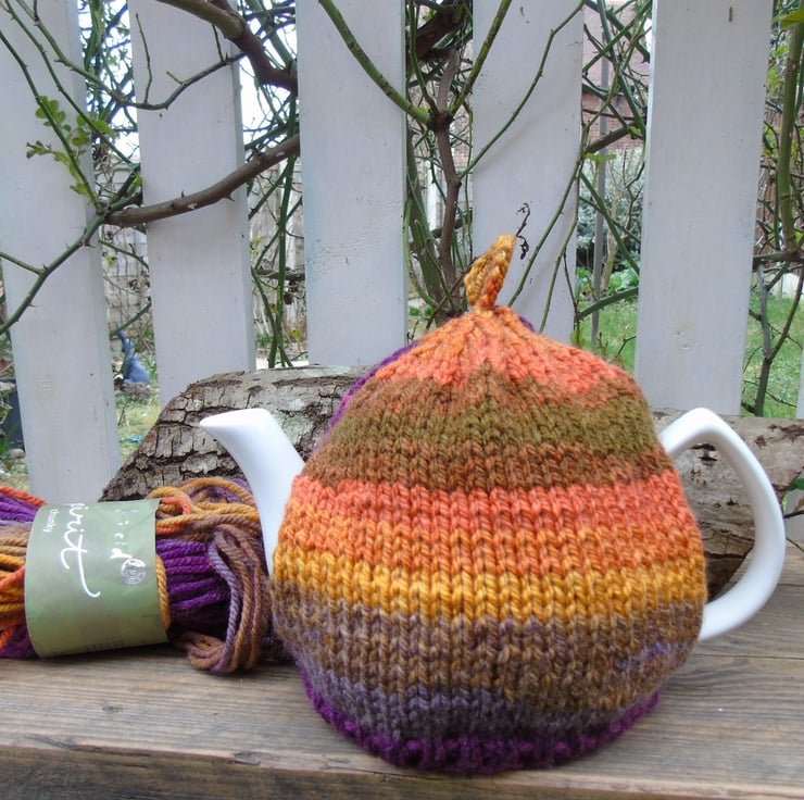 A lovely tea cosy in sunset colours. Knitted using Hayfield Spirit Chunky a 20% wool blend yarn.