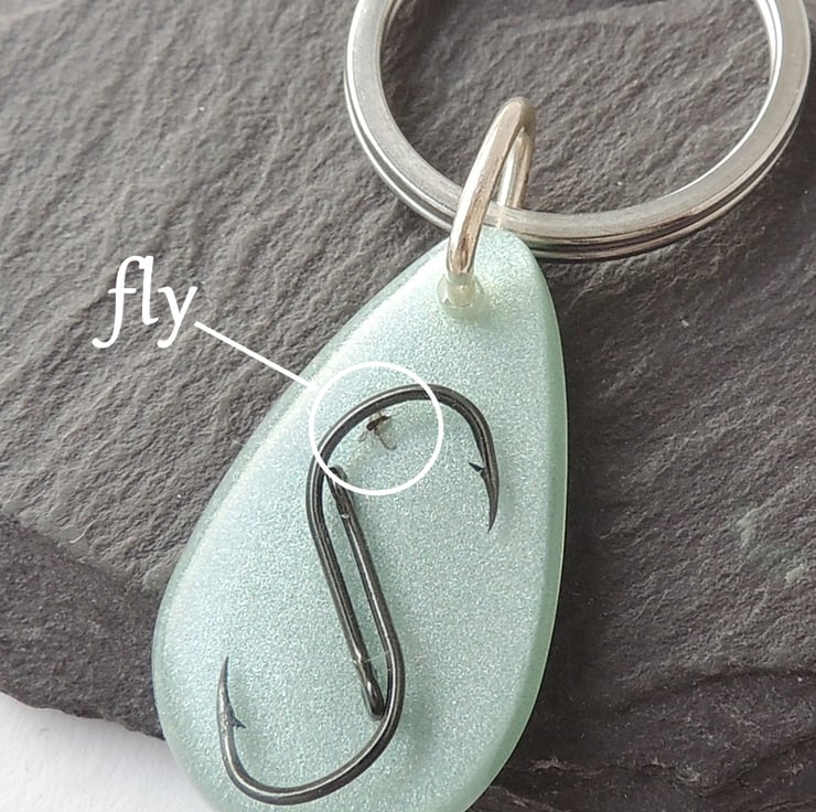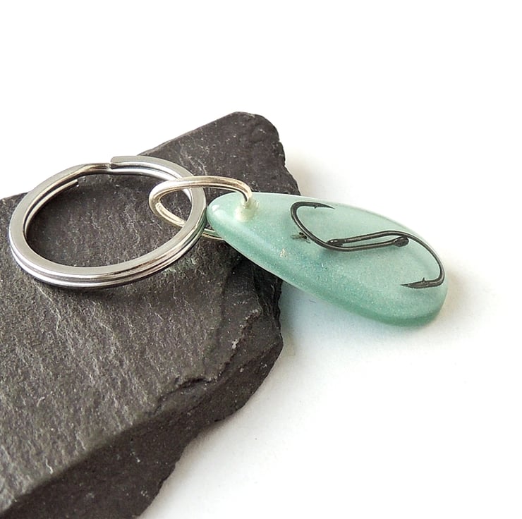 I made it by casting the fish hooks in resin, finishing with a pale green colour background and then drilled a hole in the top and added the key ring.
