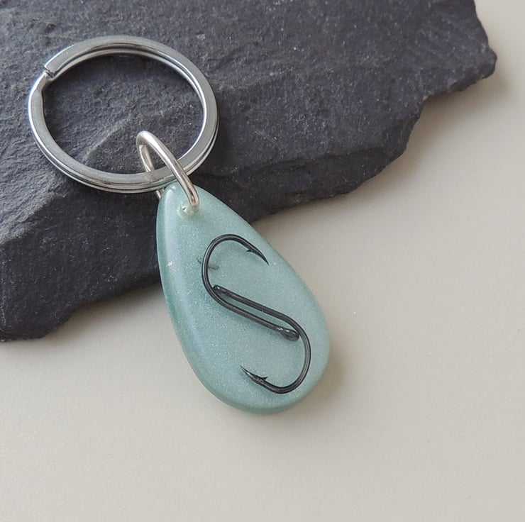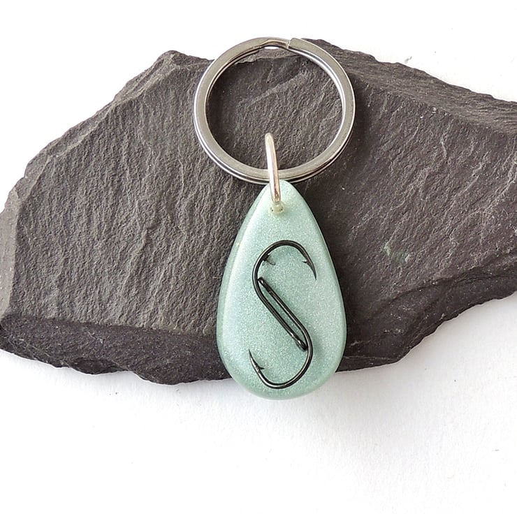 This keyring has two fish hooks placed in a letter S position in pale green colour resin.