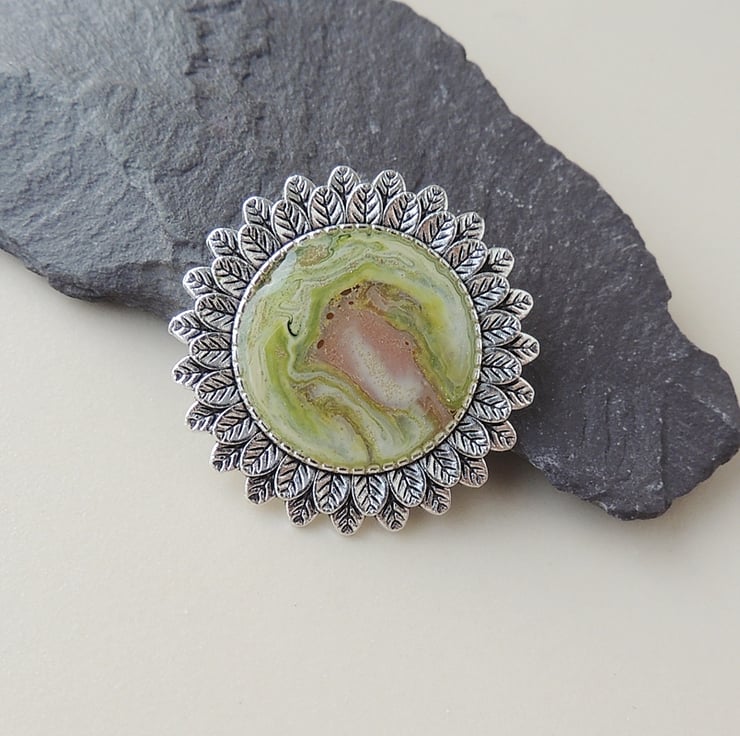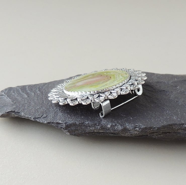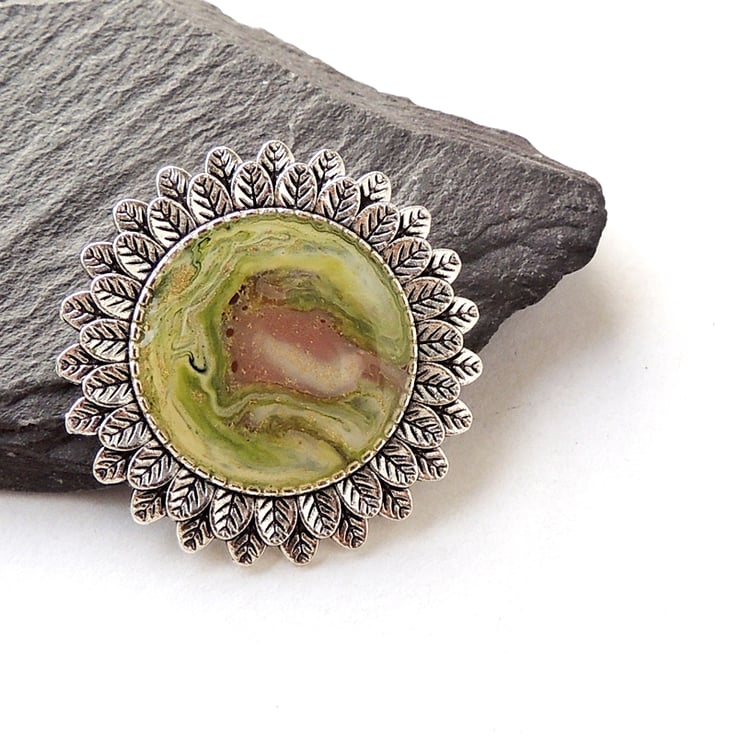 I made the marble pattern with paint and resin in the cup of an antique silver plated brooch bezel and then sealed it with a coat of clear resin.