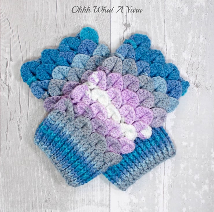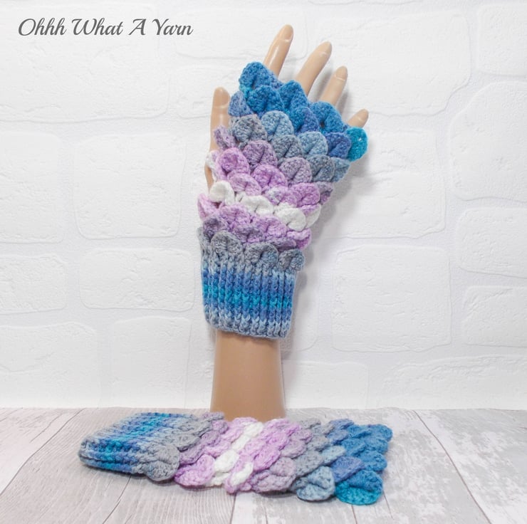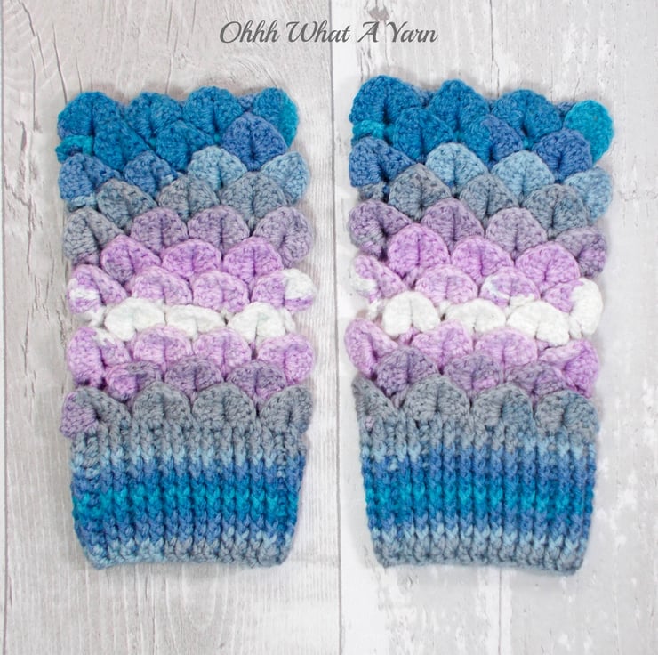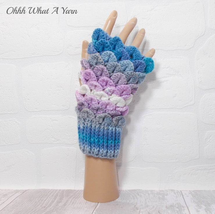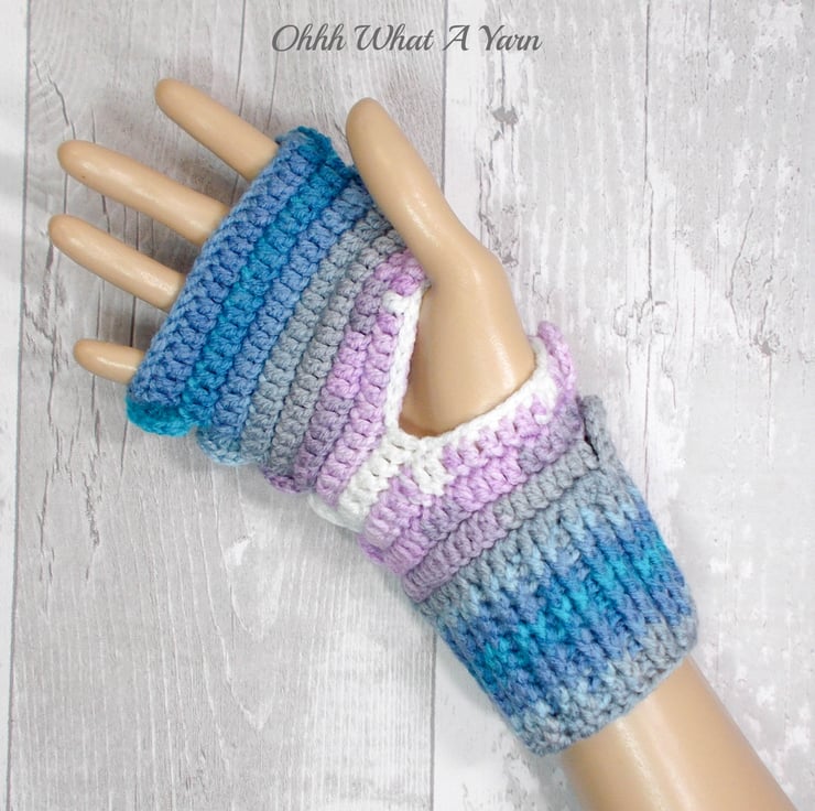 These cosy ladies fingerless gloves have been crocheted using a gorgeous colour changing yarn in shades of blue, grey, lilac and cream. The yarn is 100% acrylic.
