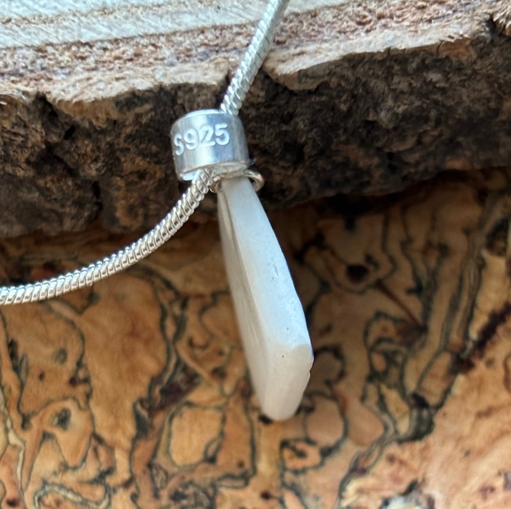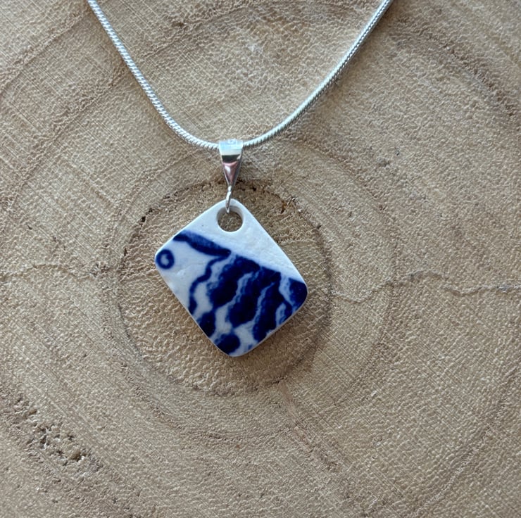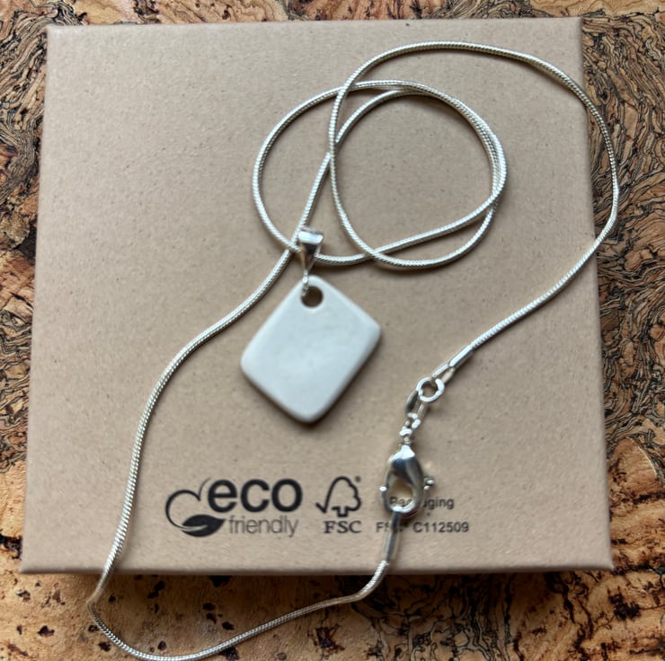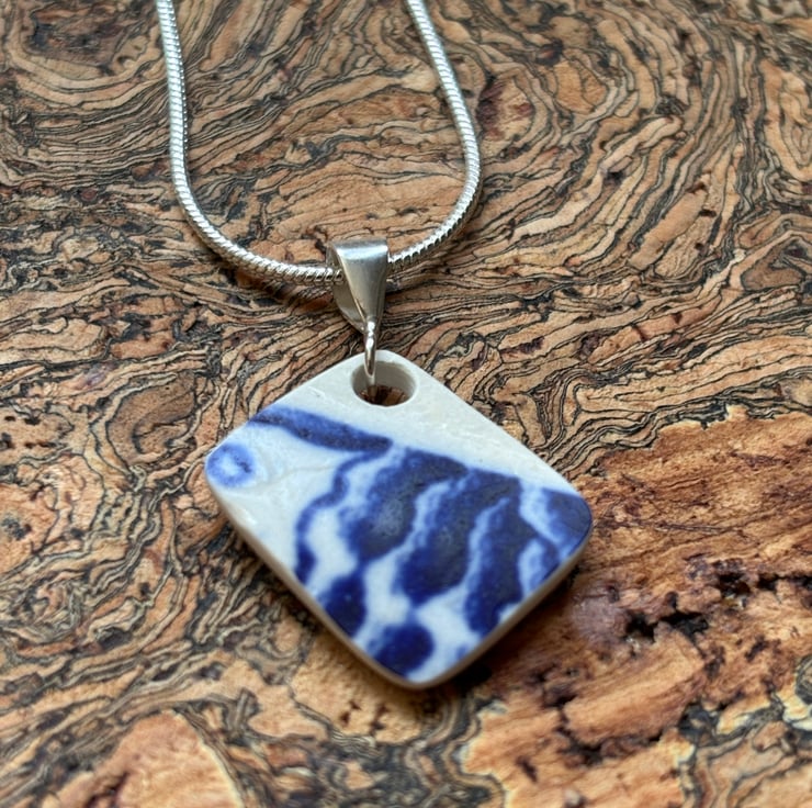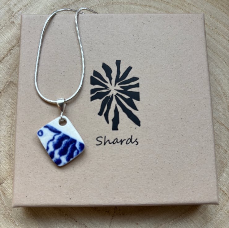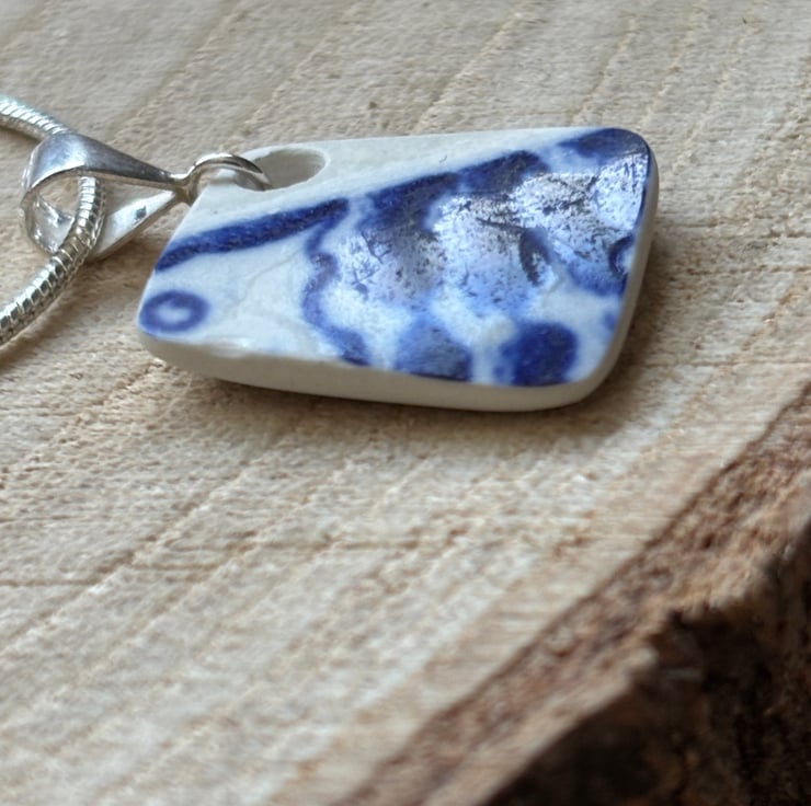 After a clean I gently drilled a hole and created a pendant. Since then I have reworked the piece to thin the ceramic and smooth the back. The shard has a slight curve, not noticeable face down but adds to the unique design.