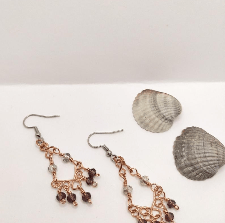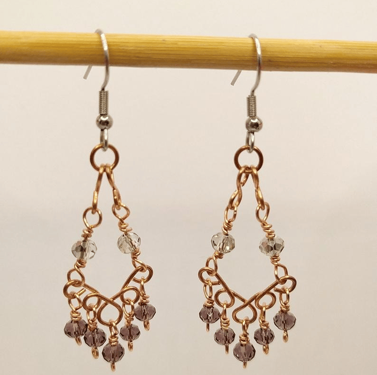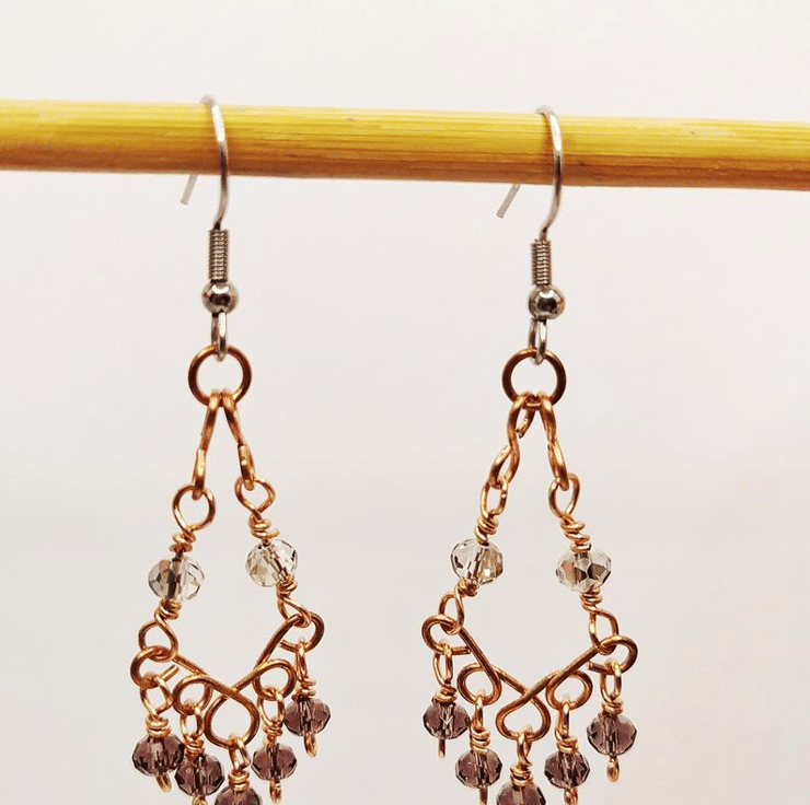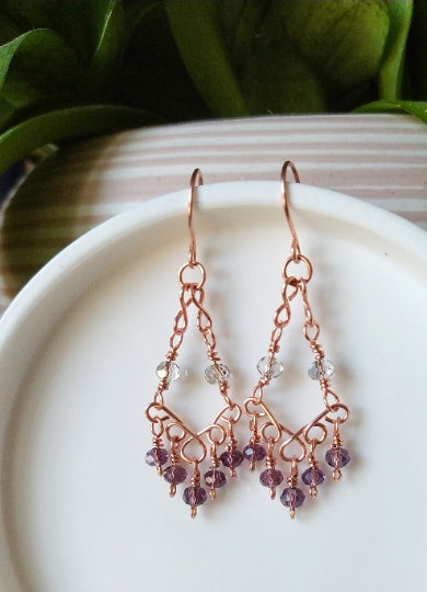 Chandelier style boho earrings, fully hand made from bare copper wire and faceted glass beads.