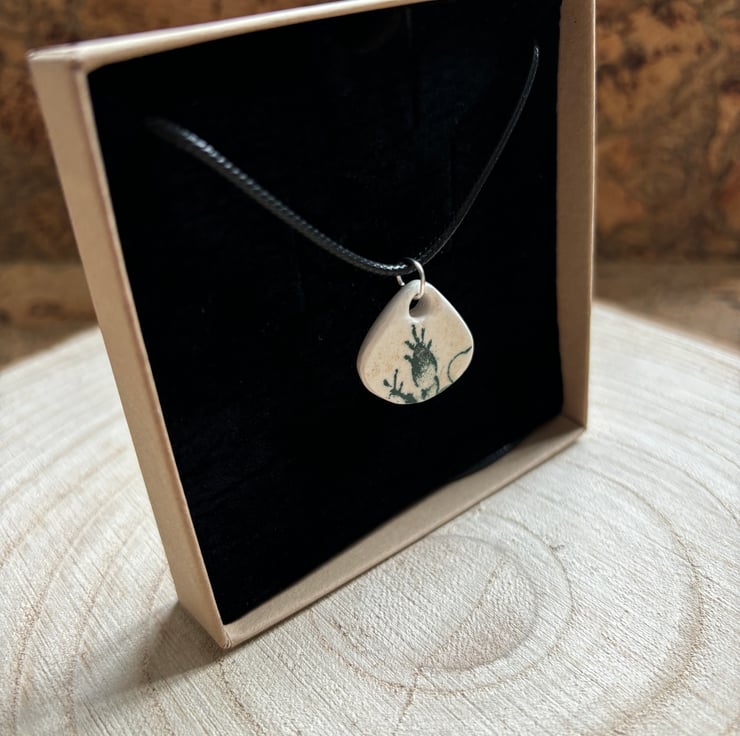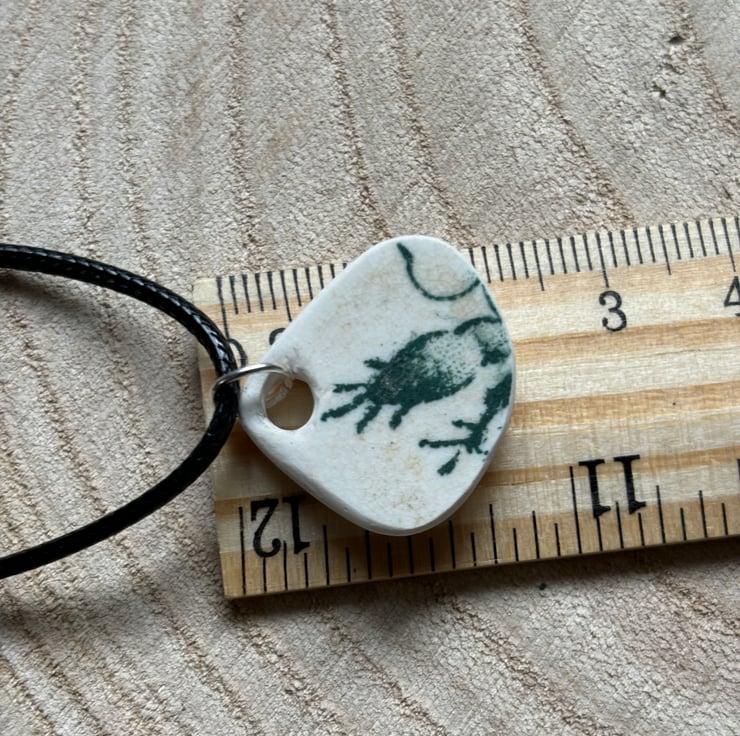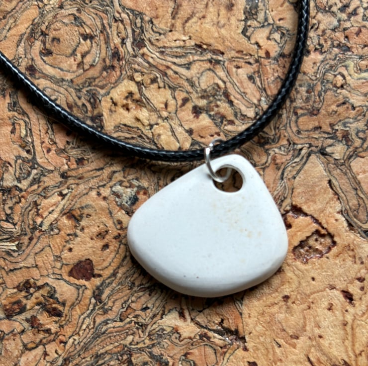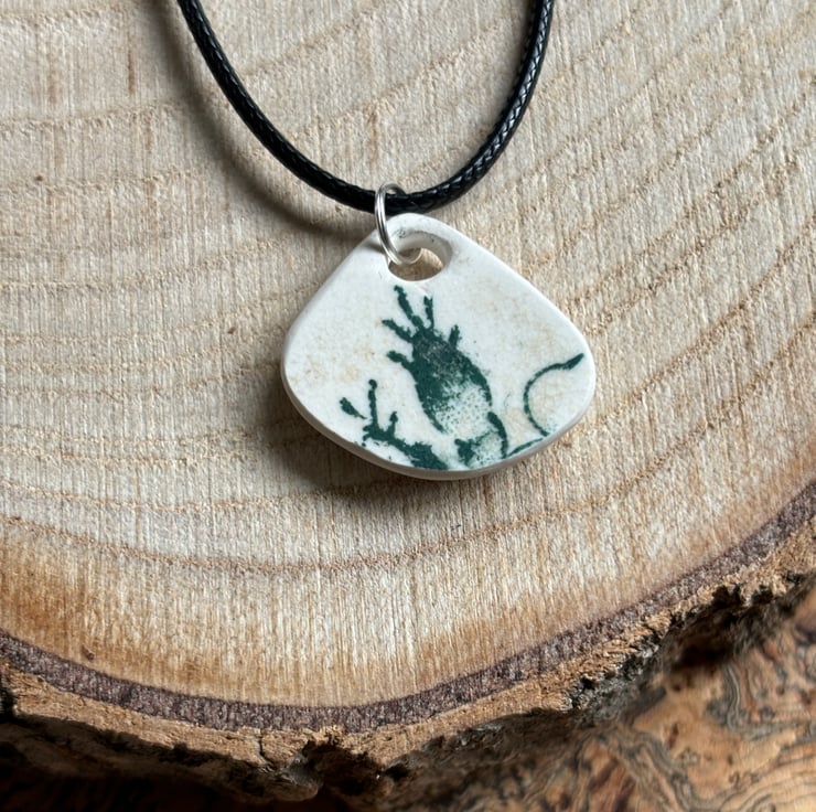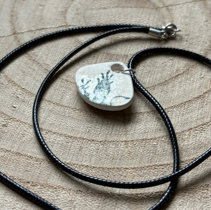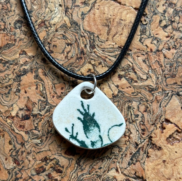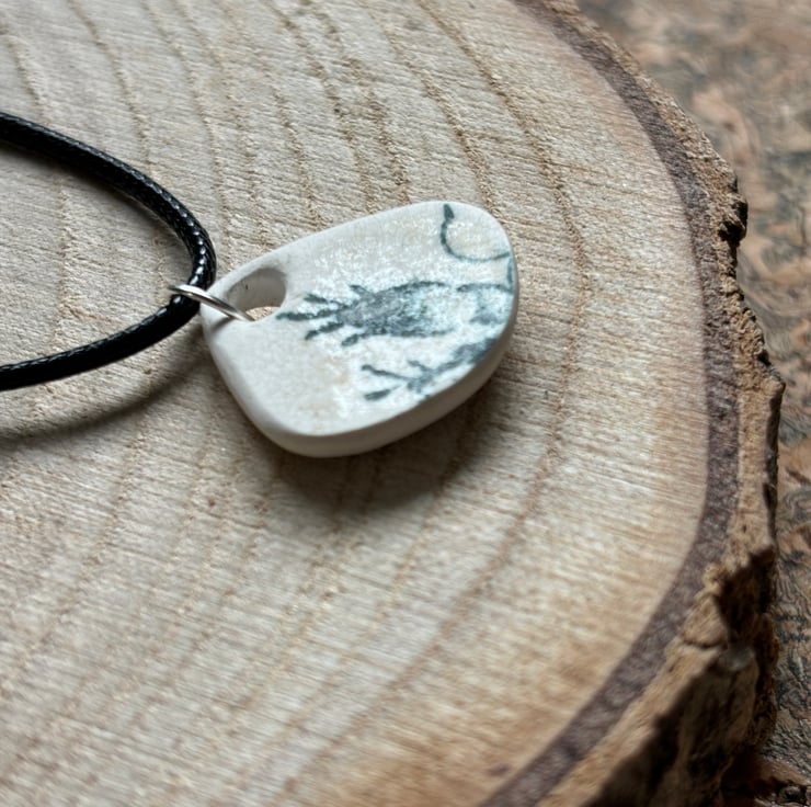 The pattern is unusual and difficult to imagine the entire design. When I first discovered it I immediately saw a cactus. After a thorough clean I managed to drill a hole and sand the sides and back. The front glaze has mostly gone but you can see a slight shine towards the bottom of the pendant. Sealed with Eco Friendly sealant.