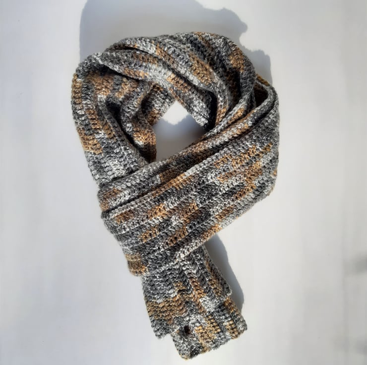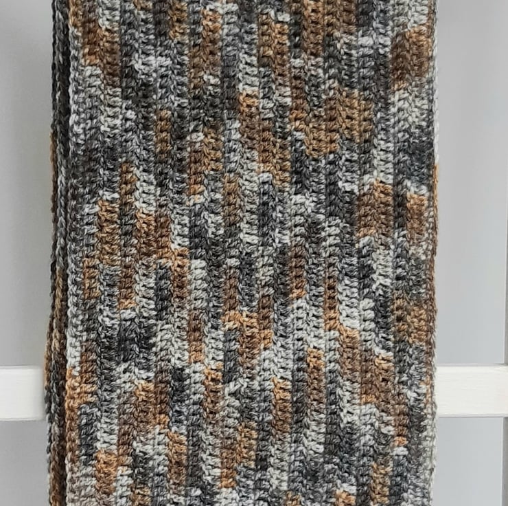 This Ochre and Grey mix, lightweight scarf is work in rows length wise, creating that classic and sophisticated look. Can be wrapped around and looped through, or worn long.