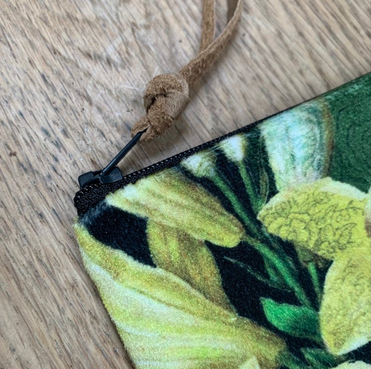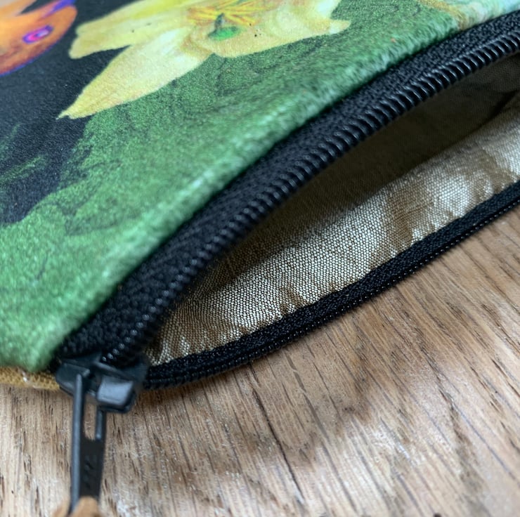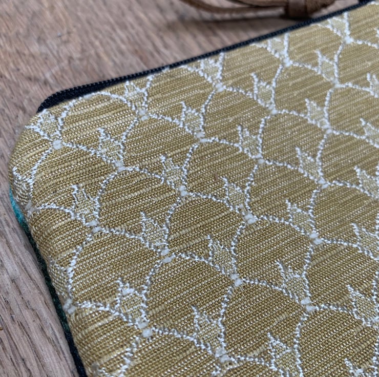 Soft velvet coin purse with pretty gold textured back in beautiful vibrant colours. The exotic bird and lily velvet is by Marianne Ley Design.