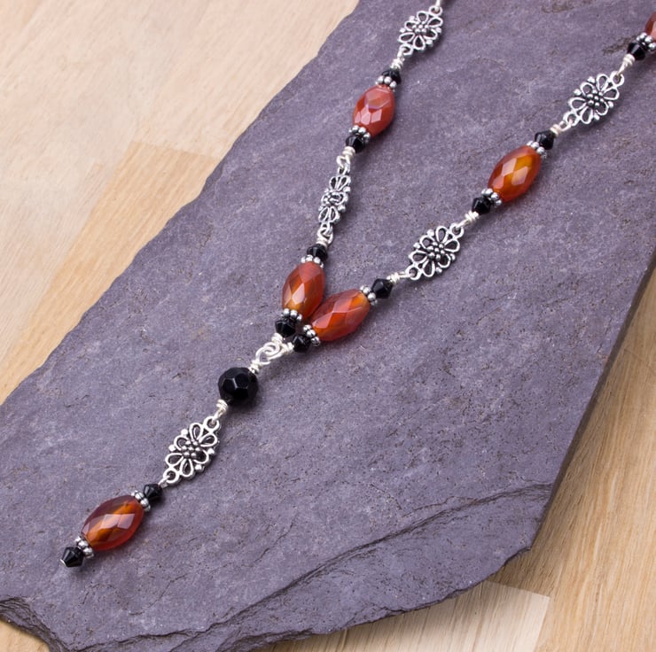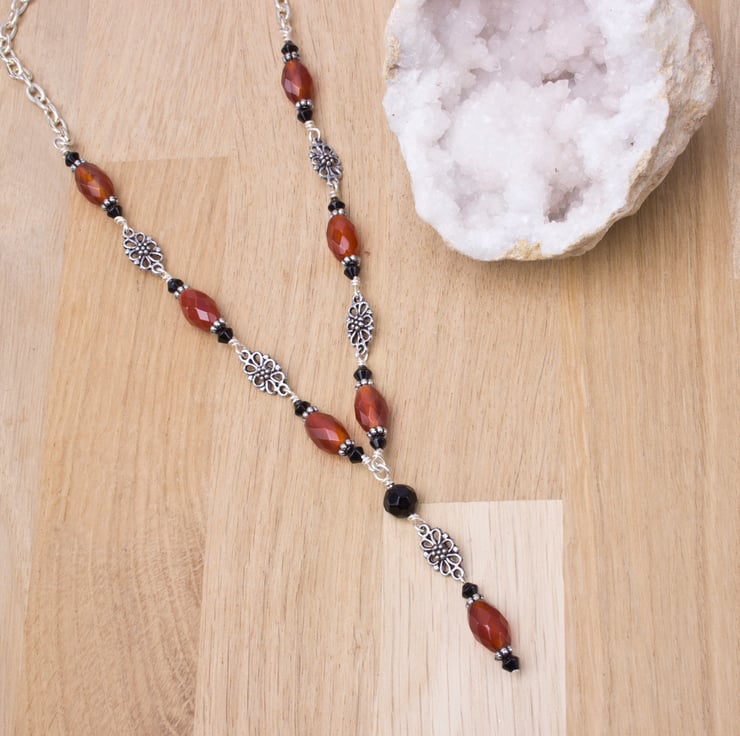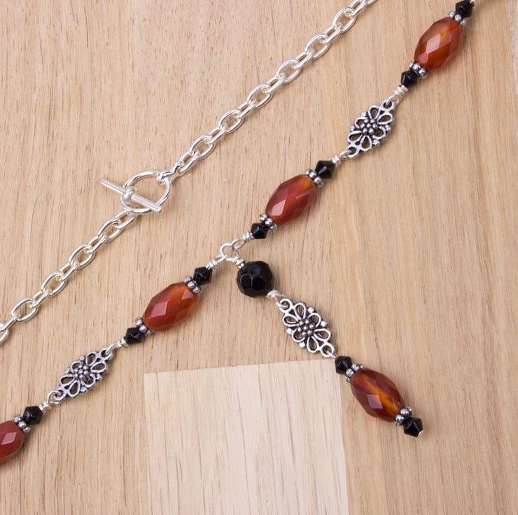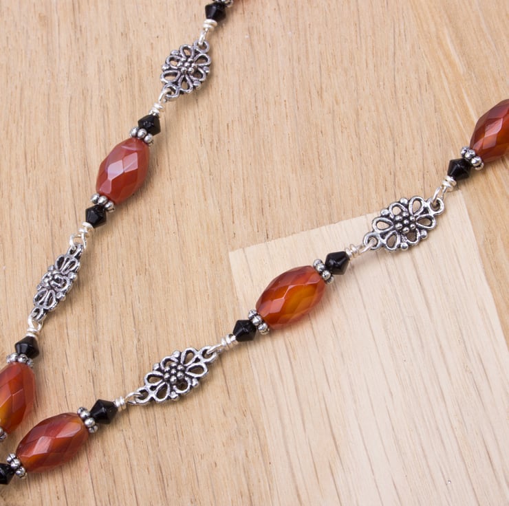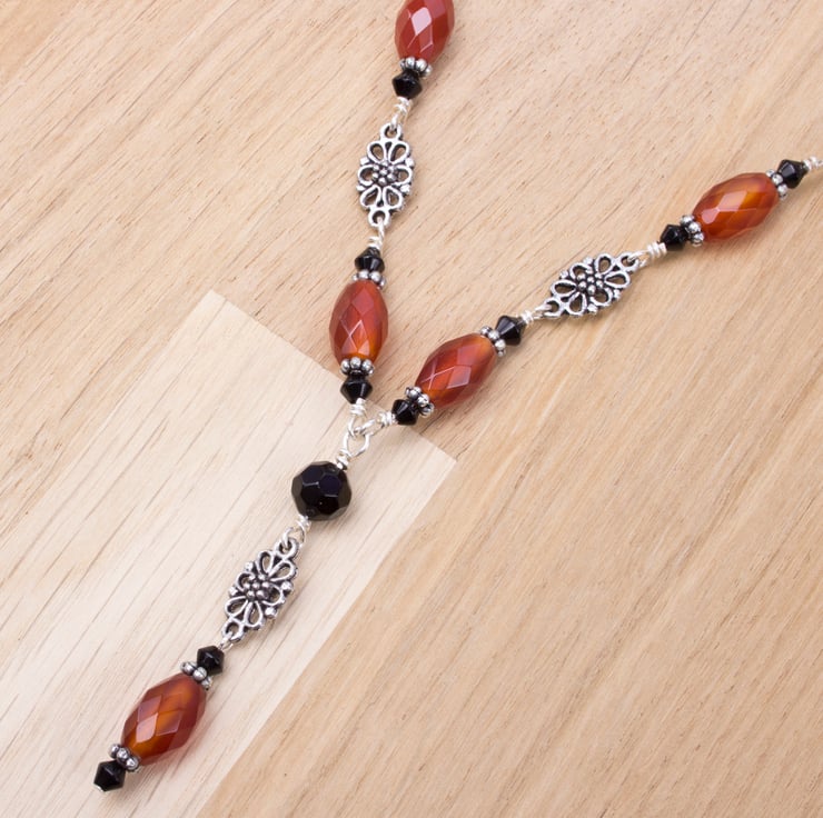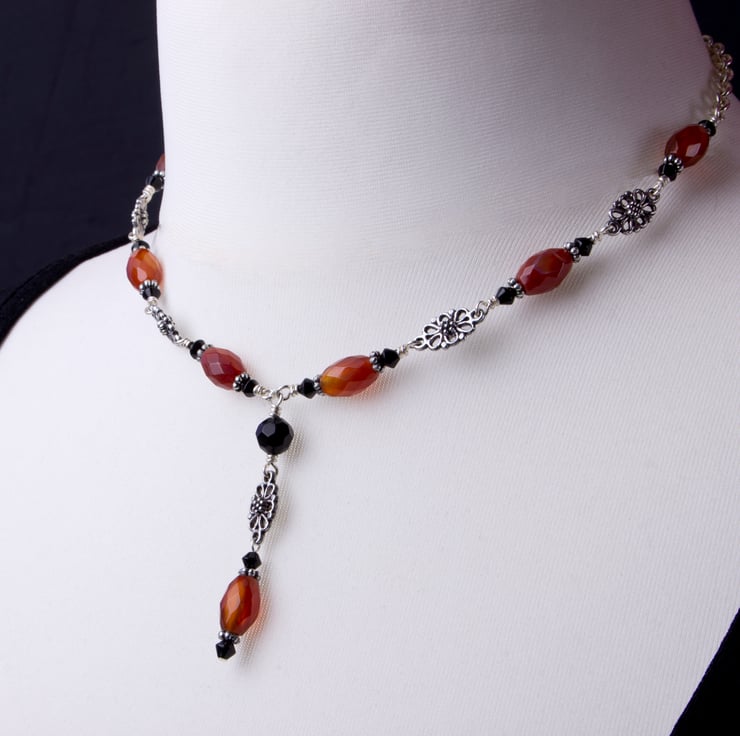 Gorgeous faceted red agate ovals are combined with black beads and bicones with Tibetan silver fancy links and spacers. Wire wrapped on a silver tone oval link chain and finished with a toggle clasp. Approximately 18 inches long with a 2 inch drop section. The red agate is an orange/red translucent gemstone.