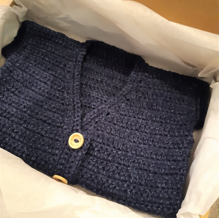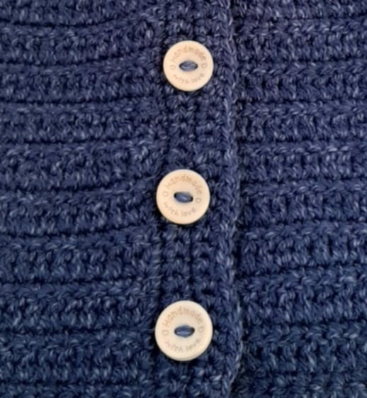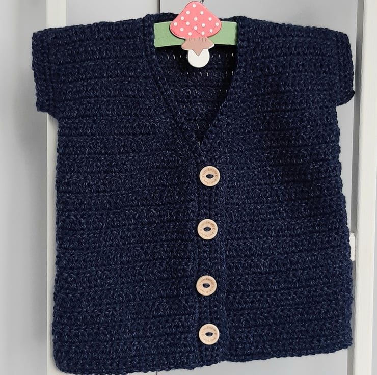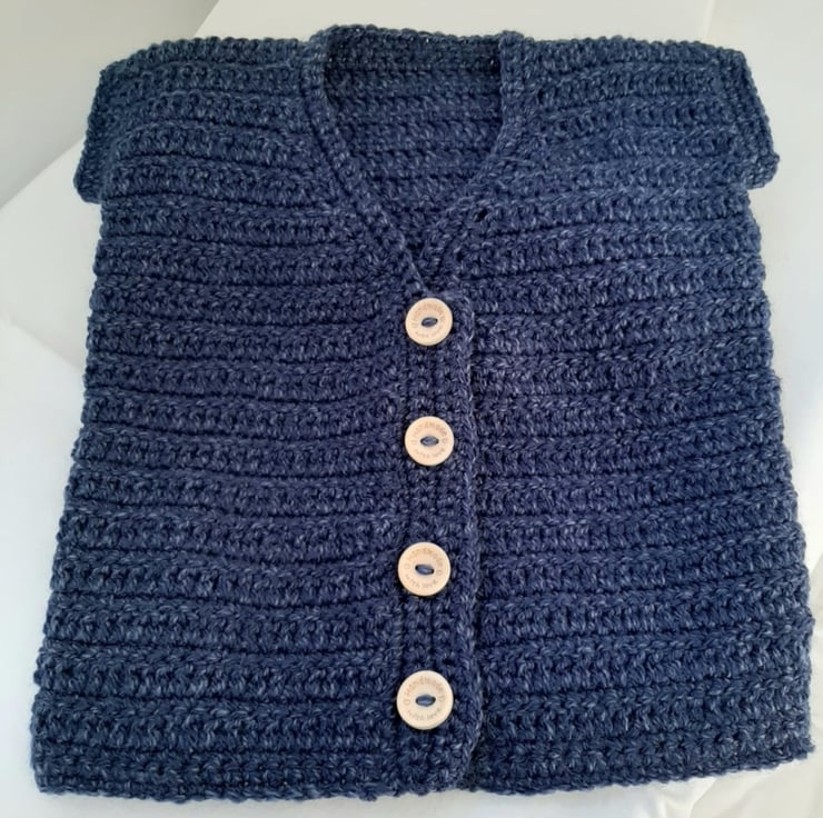 This blue crochet waistcoat, has short sleeves and is worked in a horizontal row pattern. It has lighter flecks of colour, giving a two-toned effect. It has 4 wooden buttons down the front, displaying the words, 'Handmade with love'.
