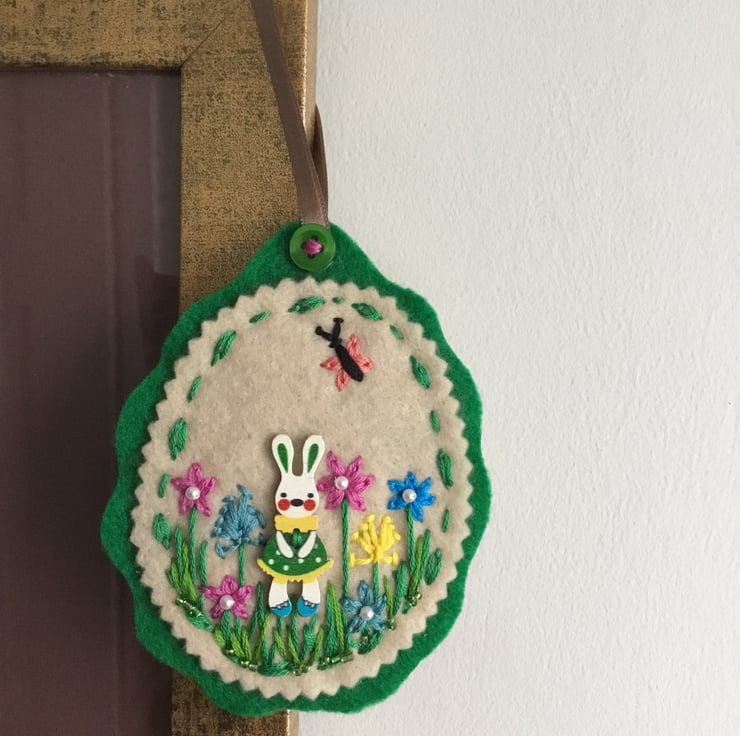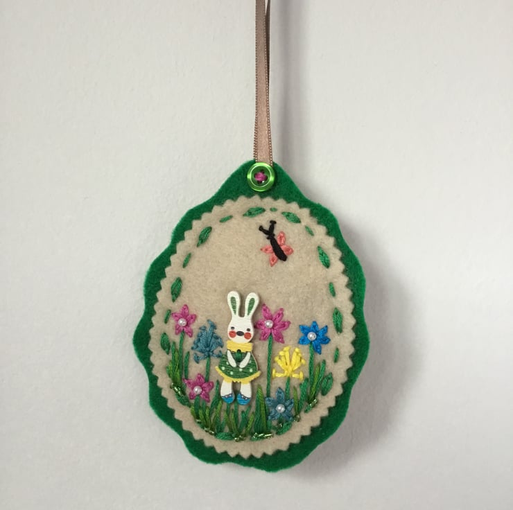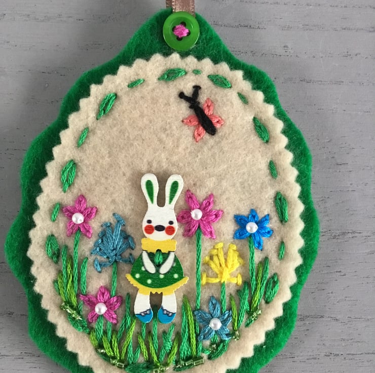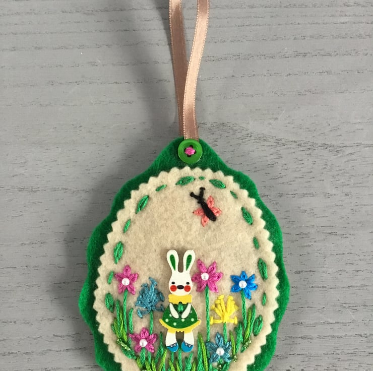This felt hanging decoration has a lovely embroidered Spring scene. A character rabbit button is sewn onto oval shaped cream and green felt. She is standing in a meadow of hand embroidered Spring flowers and grasses in blue, pink, yellow and green lazy daisy and straight stitches, dotted with pearl and green beads. A little orange butterfly is fluttering by.