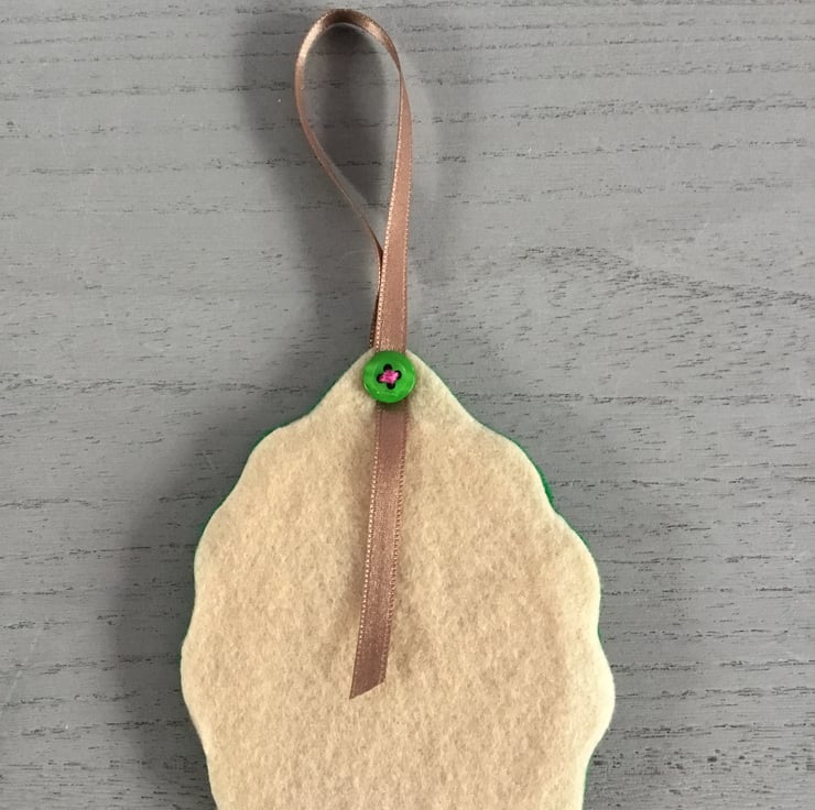 This decoration is oval shaped ..... like a decorated Easter egg. It’s approximately 4 by 3 inches (10 x 8 cms) with a 3 inch ribbon hanging loop secured with a small green button.