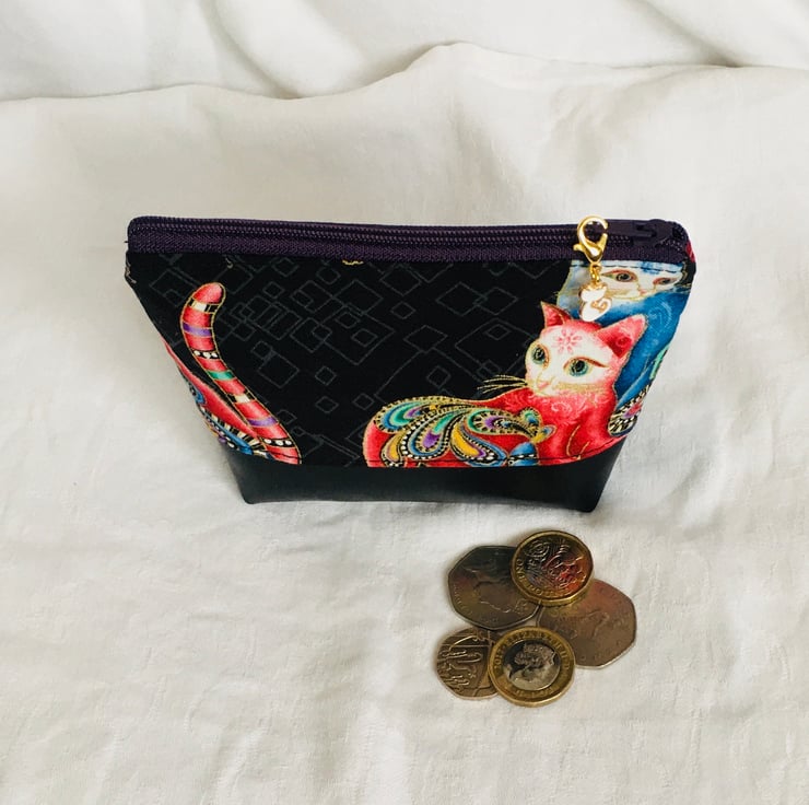 The purse has been made from black faux leather, for the base and a high quality cotton fabric with Cat print on black background for the top of the purse. The purse has been fully lined with a plain cotton fabric and finished with zip across full length on top and finished with a charm zip pull.