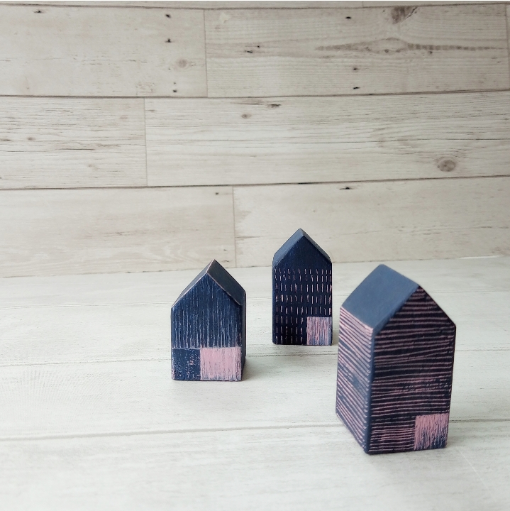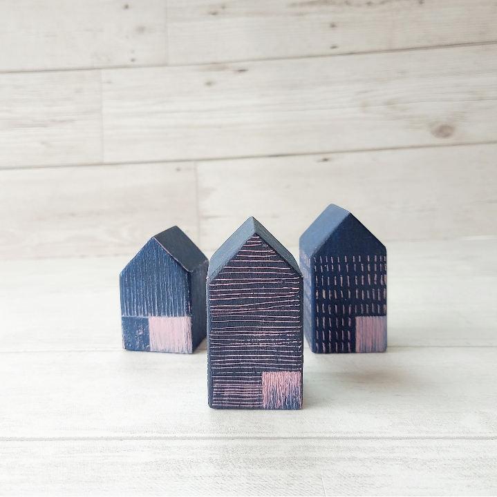 I moved to the countryside in 2019 and had been building up a stash of wood offcuts from other projects, intending to use them for firewood for the coming winter; realising that a lot of this wood was high quality pine which was too good to burn, I came up with the idea of using it to make little houses (a shape which is relatively easy to cut with limited woodworking skills/equipment). As it turns out, little houses are not only en vogue but they are the perfect canvas for experimenting with colour and pattern!