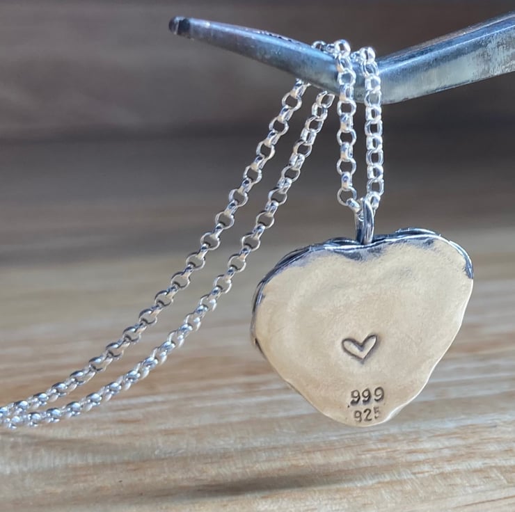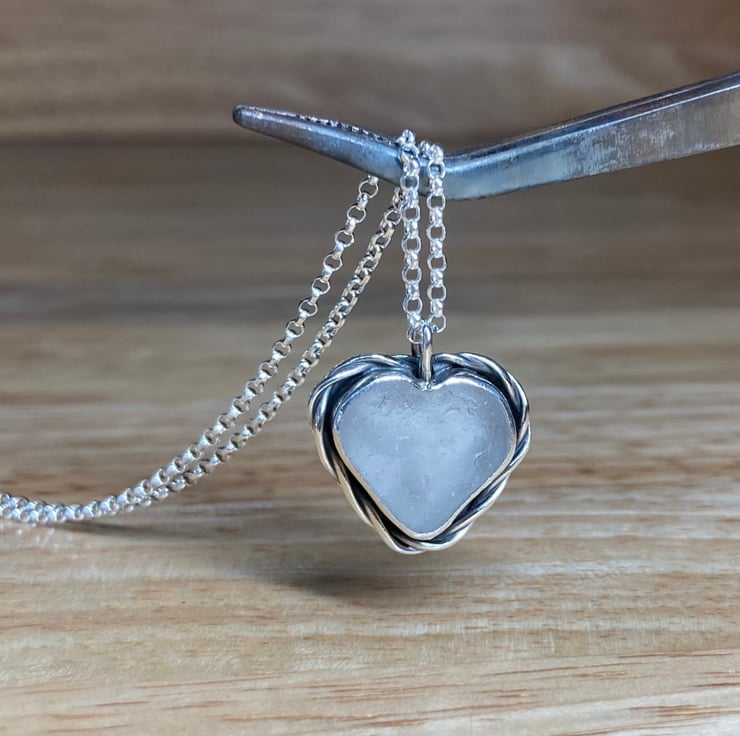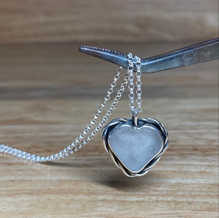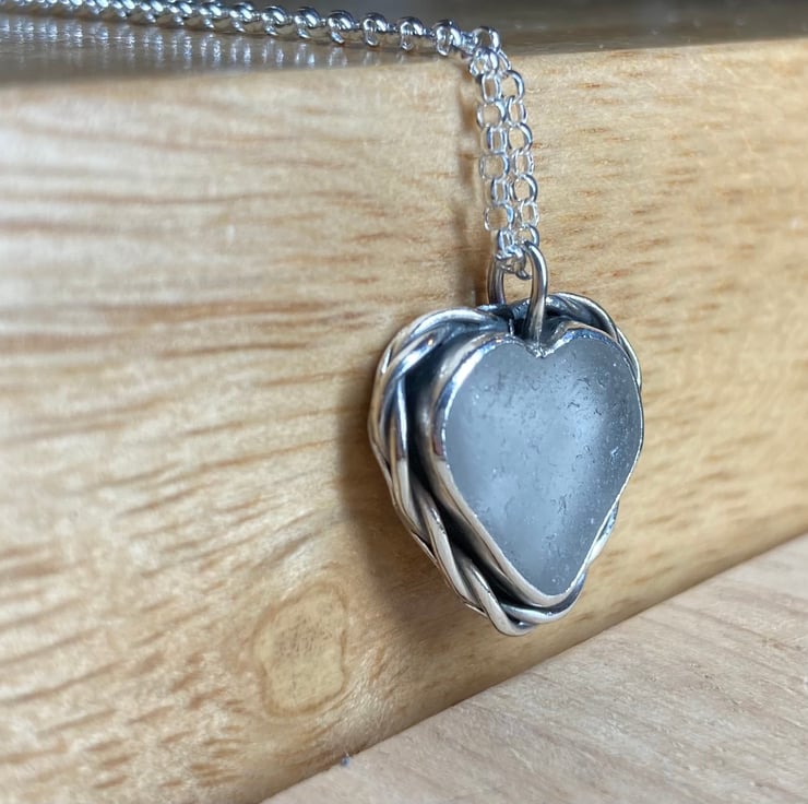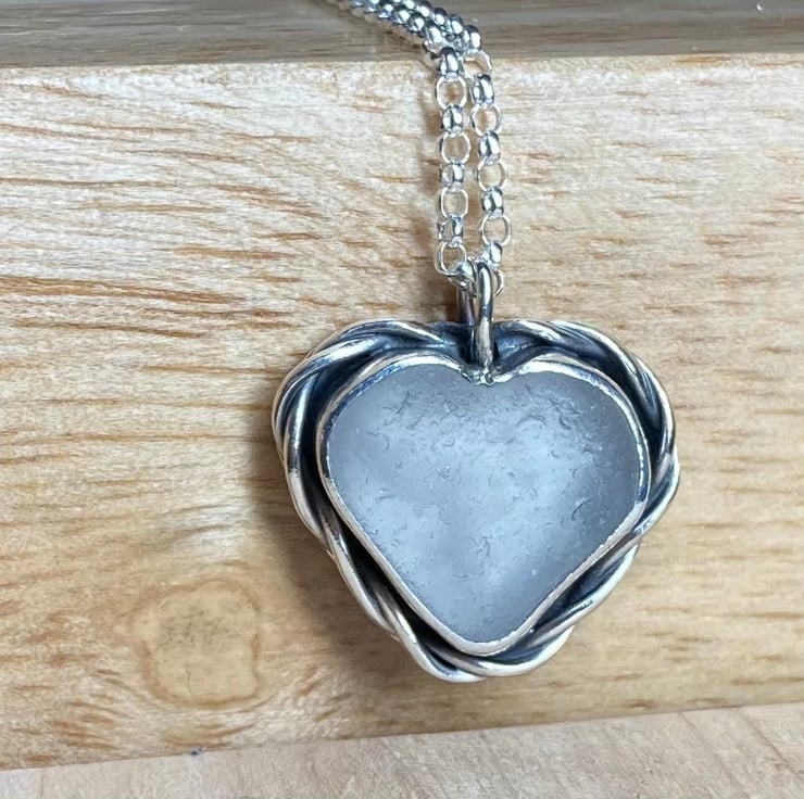 Beautiful beige grey heart shaped piece of welsh sea glass found on a beach in North Wales and handset in fine and sterling silver. The sea glass is framed with a hand twisted sterling silver rope and hangs on an 18’’ long 1.4mm thick sterling silver diamond cut belcher chain.