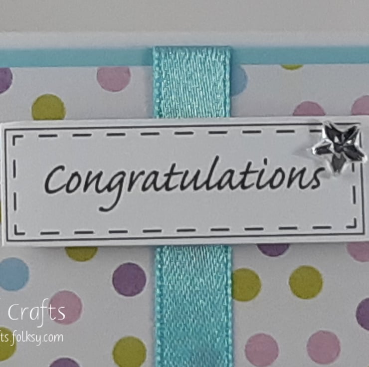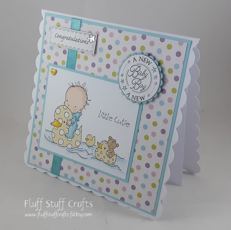 Square, scalloped new baby card featuring a hand coloured image of a baby and his teddy floating on rubber ducks in the bath. The image and sentiment 'A New Baby Boy' have been mounted onto aqua coloured card and overlaid onto a polka dot background. A length of satin ribbon runs under the image and the additional sentiment 'Congratulations' has also been added.