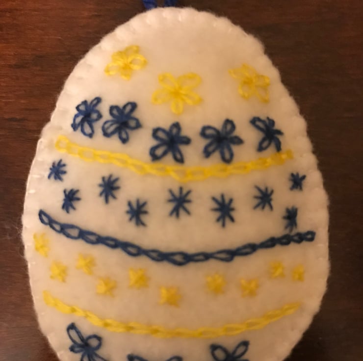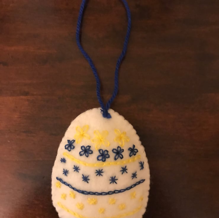 This white felt Easter egg has been embroidered on both sides with royal blue and yellow embroidery thread. It would look lovely on an Easter tree or given as a gift. Measuring 9cm approx. in length. The egg is lightly stuffed and comes complete with a wool hanging loop.