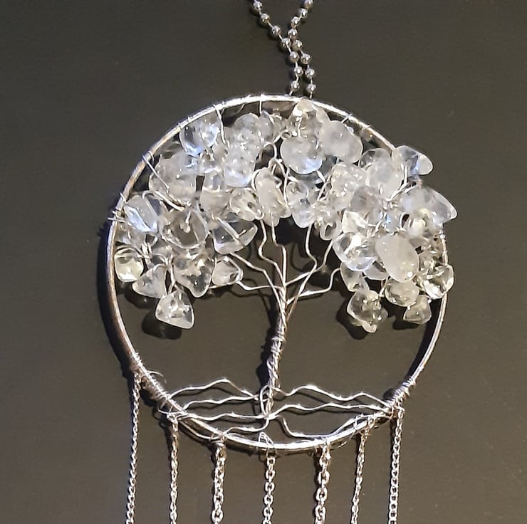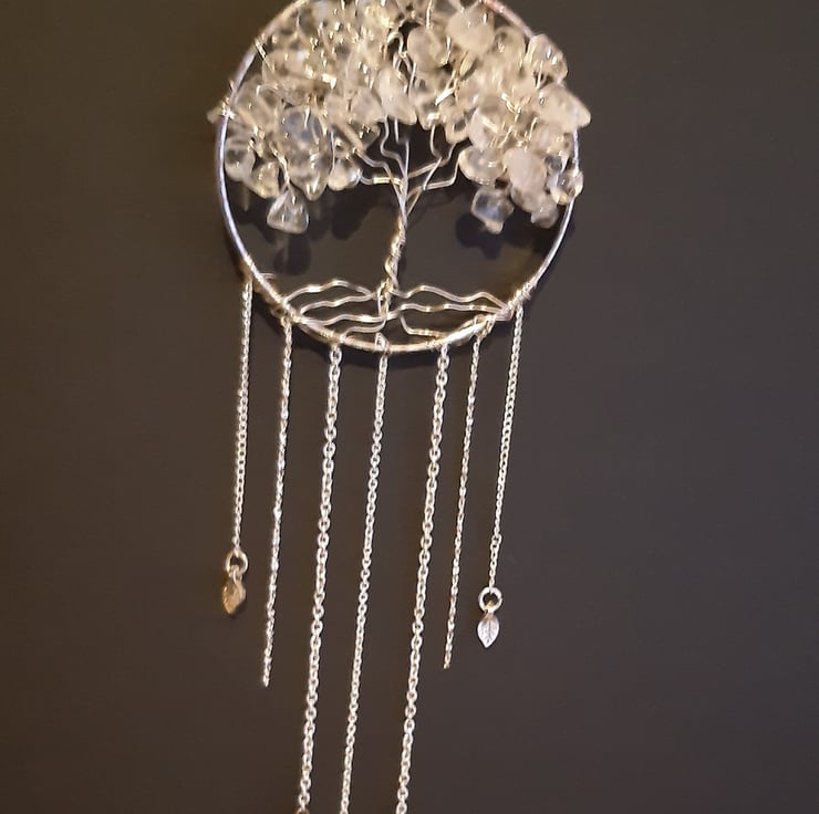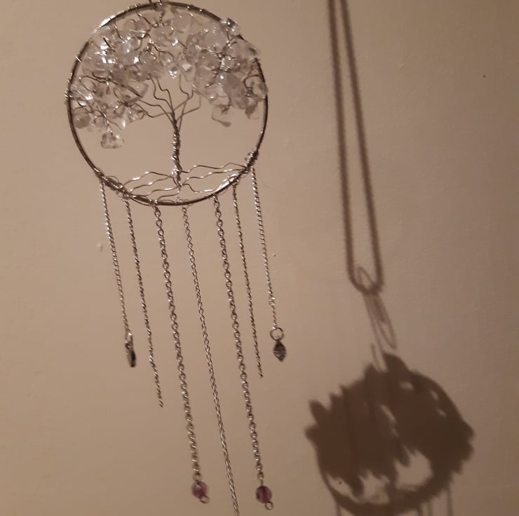 clear quartz and wire made into a lovely tree set within a metal bangle with metal chains hanging from bangle with metal leaves purple beads and a metal feather , custom made for Mia