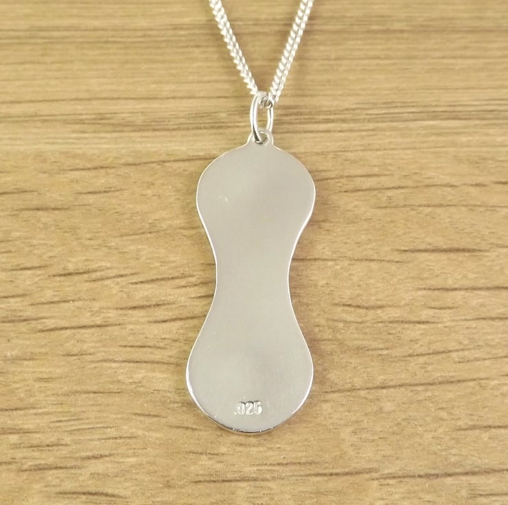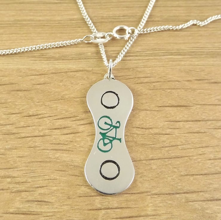 This bicycle pendant has been inspired by the links of a bicycle chain and have been lovingly handcrafted in Britain. It's made from 1mm recycled sterling silver sheet which is etched before being cut out by hand, the edges are then smoothed using files and emery paper. The pendant is shaped using a punch and hammer before a black and a coloured resin based enamel are added to the etched areas. It is then polished and attached to a chain.