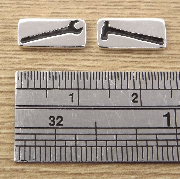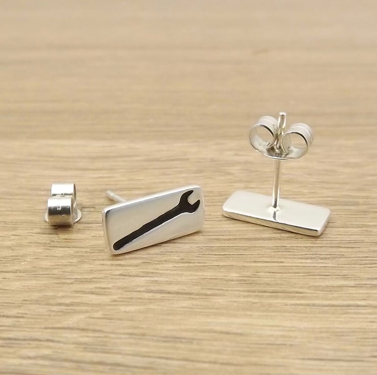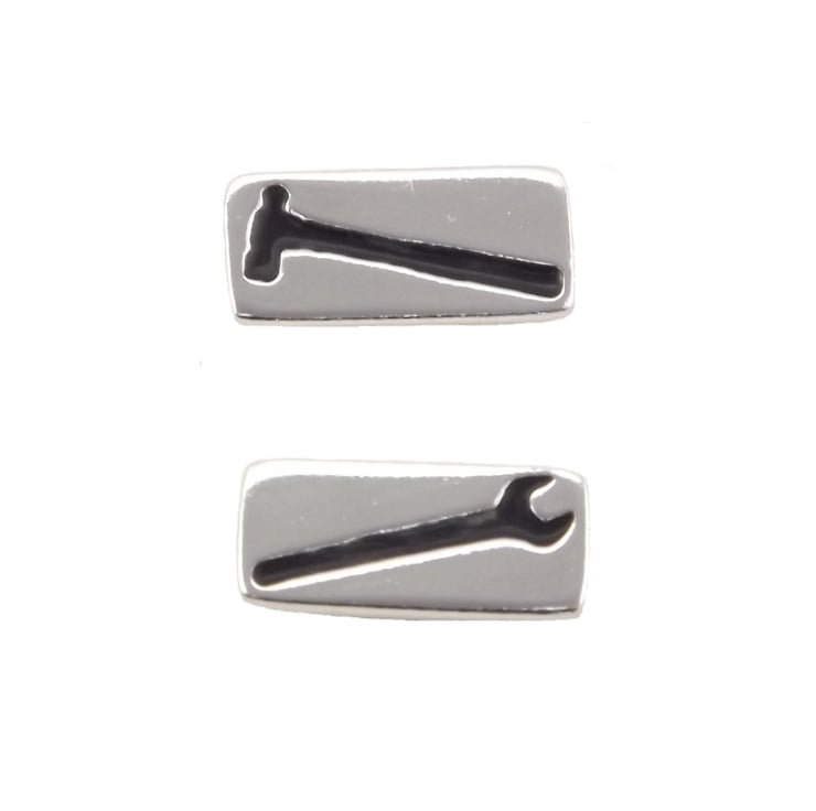These stud earrings feature an images of tools (a hammer and a spanner) and have been lovingly crafted by hand in Britain. They are made from sterling silver sheet and are etched before being cut by hand, the edges are then smoothed using files and emery paper before the 11mm ear pins are then soldered onto the back. A coloured resin based enamel is added to the etched areas and then the earrings are polished.