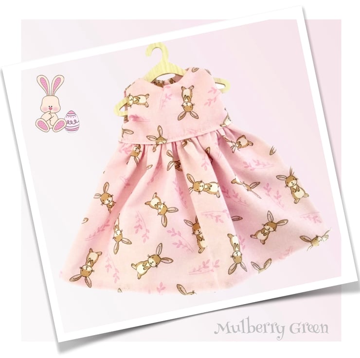 A pretty little pink dress, in an Easter bunnies print to fit the Mulberry Green characters. The dress is made from cotton, has a full skirt, a lined bodice and comes on a cute little wooden hanger.