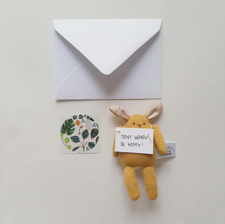 - Please note this is a sample photo of what the bunny looks like so it may vary slightly due to it being hand sewn, as well as the sticker with the envelope.