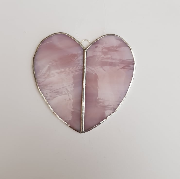 This large two piece heart is made using lilac glass and has a ring and invisible thread for hanging.