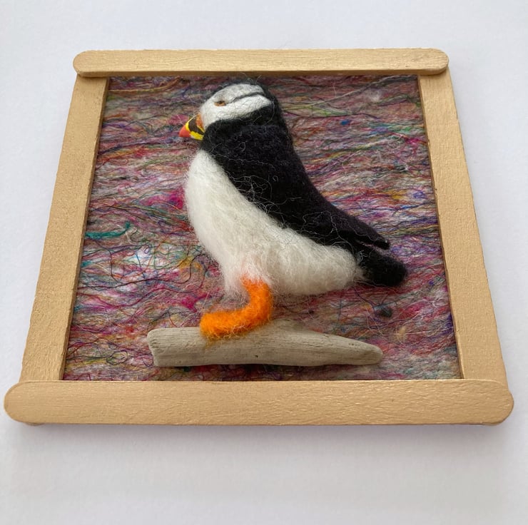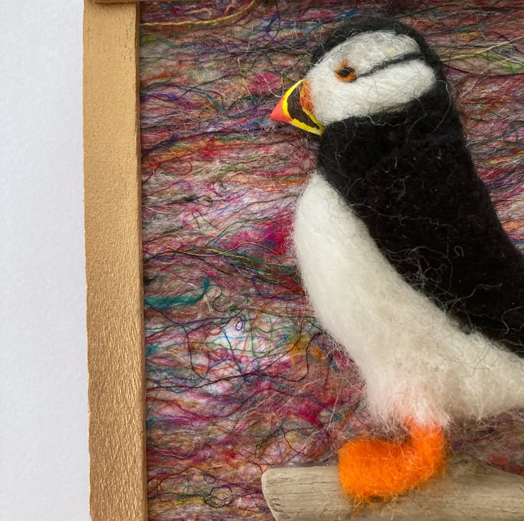 This sweet little picture measures approximately 11cm x 11cm. The puffin has been needle felted with a flat back to create a 3D effect to the picture. His beak is made from clay and he has been mounted standing on a small piece of driftwood and attached to a background of multicoloured but predominantly pink handmade silk paper. The picture has then been framed by gold painted wooden sticks. A small thread has been added to the reverse to facilitate hanging.