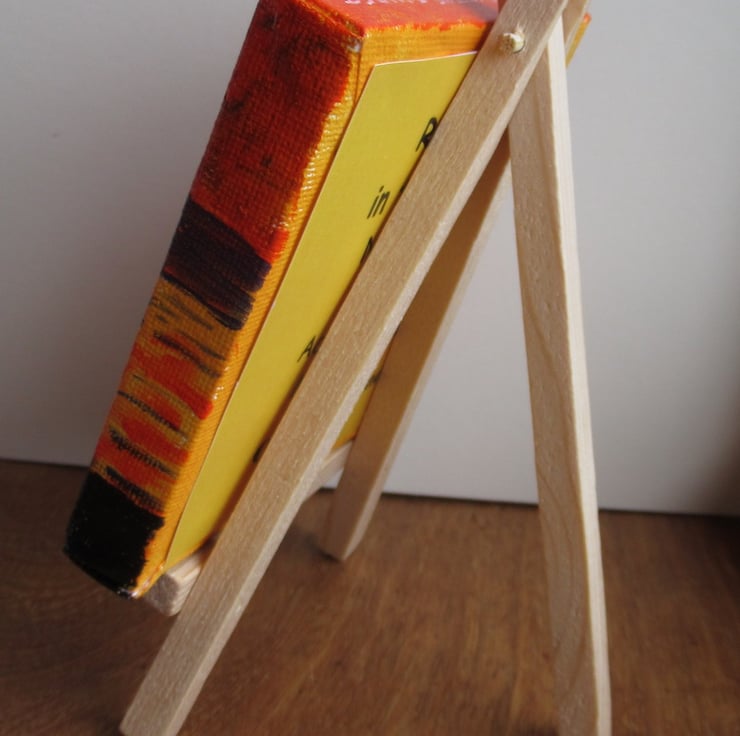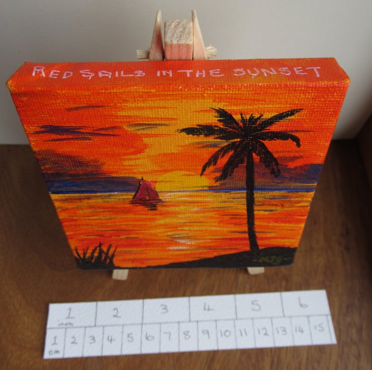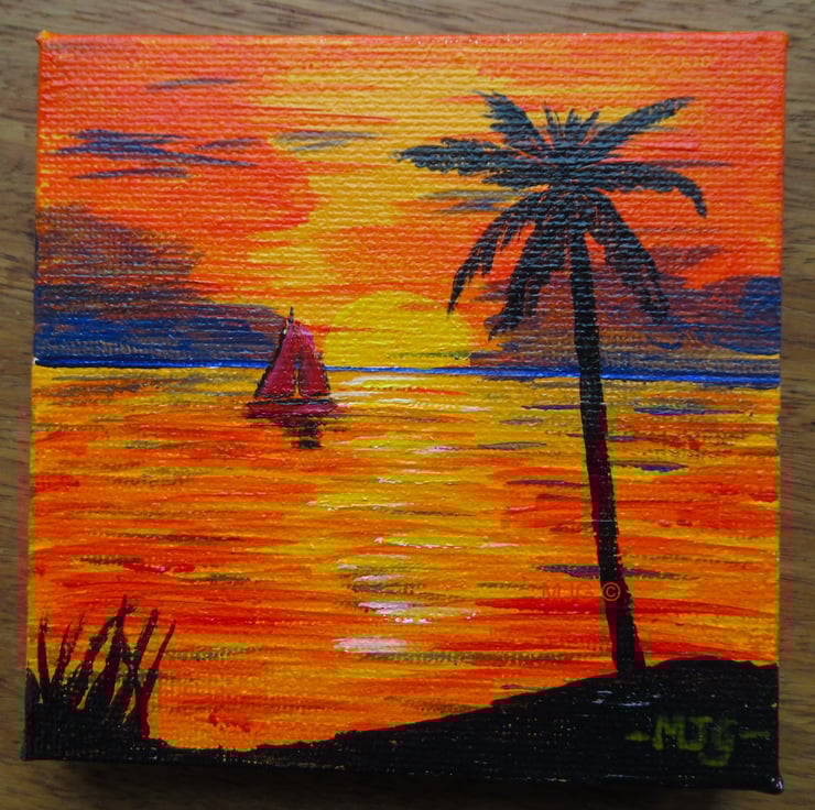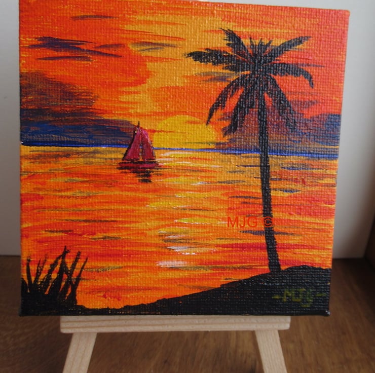 A 10 x 10 cm original acrylic painting on a mini canvas of sunset over a tropical beach - the easel is included.